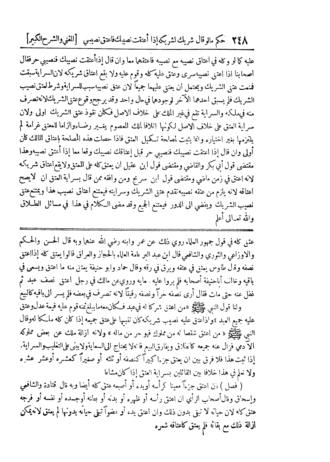 إذا ثبت هذا فلا فرق بين أن يعتق جزءاً كبيراً كنصفه أو ثلثه أو صغيراً كعشره أو عشر عشره ولا نعلم في هذا خلافاً بين القائلين بسراية العتق إذا كان مشاعا (فصل) قان أعتق جزءاً معيناً كرأسه أو يده أو أصبعه عتق كله أيضاً وبه قال قتادة والشافعي وإسحاق وقال أصحاب الرأي إن أعتق رأسه أو ظهره أو بدنه أو بطنه أو جسده أو نفسه أو فرجه عتق كله لأن حياته لا تبقى بدون ذلك وإن أعتق يده أو عضواً تبقى حياته بدونها لم يعتق لانها يمكن إزالة ذلك مع بقائه فلم يعتق كاعتاقه شعره