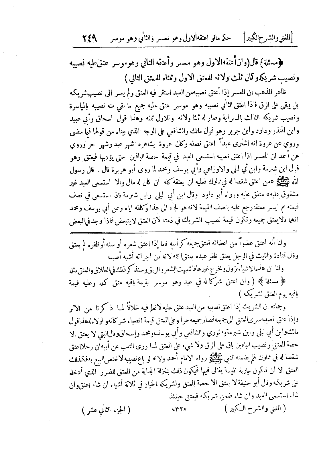 مالك وابن أبي ليلى وابن شبرمة والثوري والشافعي وأبي يوسف ومحمد وإسحاق وقال البتي لا يعتق إلا حصة المعتق ونصيب الباقين باق على الرق ولا شئ على المعتق لما روى التلب عن أبيه أن رجلا أعتق شقصاً له في مملوك فلم يضمنه النبي صلى الله عليه وسلم رواه الإمام أحمد ولأنه لو باع نصيبه لاختص البيع به فكذلك العتق إلا أن تكون جارية نفيسة يغالي فيها فيكون ذلك بمنزلة الجاية من المعتق للضرر الذي أدخله على شريكه وقال أبو حنيفة لا يعتق إلا حصة المعتق ولشريكه الخيار في ثلاثة أشياء إن شاء أعتق وإن شاء استسعى العبد وإن شاء ضمن شريكه فيعتق حينئذ