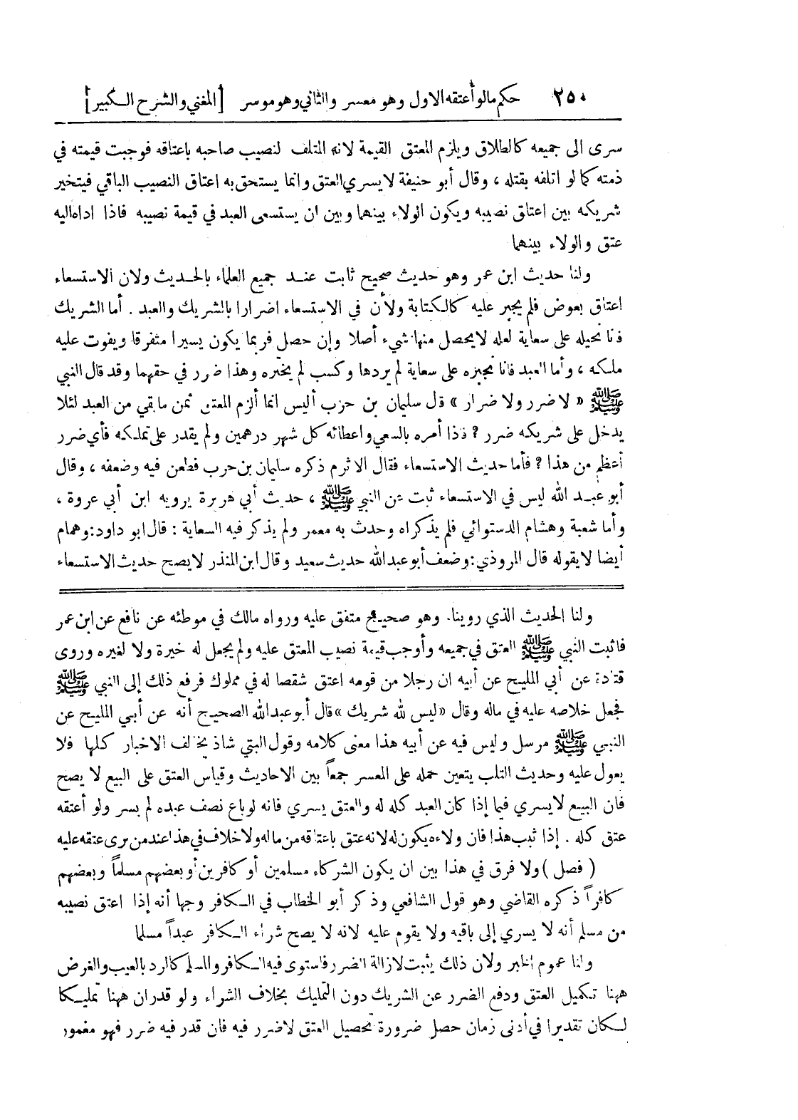 ولنا الحديث الذي روينا وهو صحيح متفق عليه ورواه مالك في موطئه عن نافع عن ابن عمر فأثبت النبي صلى الله عليه وسلم العتق في جميعه وأوجب قيمة نصيب المعتق عليه ولم يجعل له خيرة ولا لغيره ورورى قتادة عن أبي المليح عن أبيه أن رجلا من قومه أعتق شقصاً له في مملوك فرفع ذلك إلى النبي صلى الله عليه وسلم فجعل خلاصه عليه في ماله وقال (ليس لله شريك) قال أبو عبد الله الصحيح أنه عن أبي المليح عن النبي صلى الله عليه وسلم مرسل وليس فيه عن أبيه هذا معنى كلامه وقول البتي شاذ يخالف الأخبار كلها فلا يعول عليه وحديث التلب يتعين حمله على المعسر جمعاً بين الأحاديث وقياس العتق على البيع لا يصح فإن البيع لا يسري فيما إذا كان العبد كله له والعتق يسري فإنه لو باع نصف عبده لم يسر ولو أعتقه عتق كله.