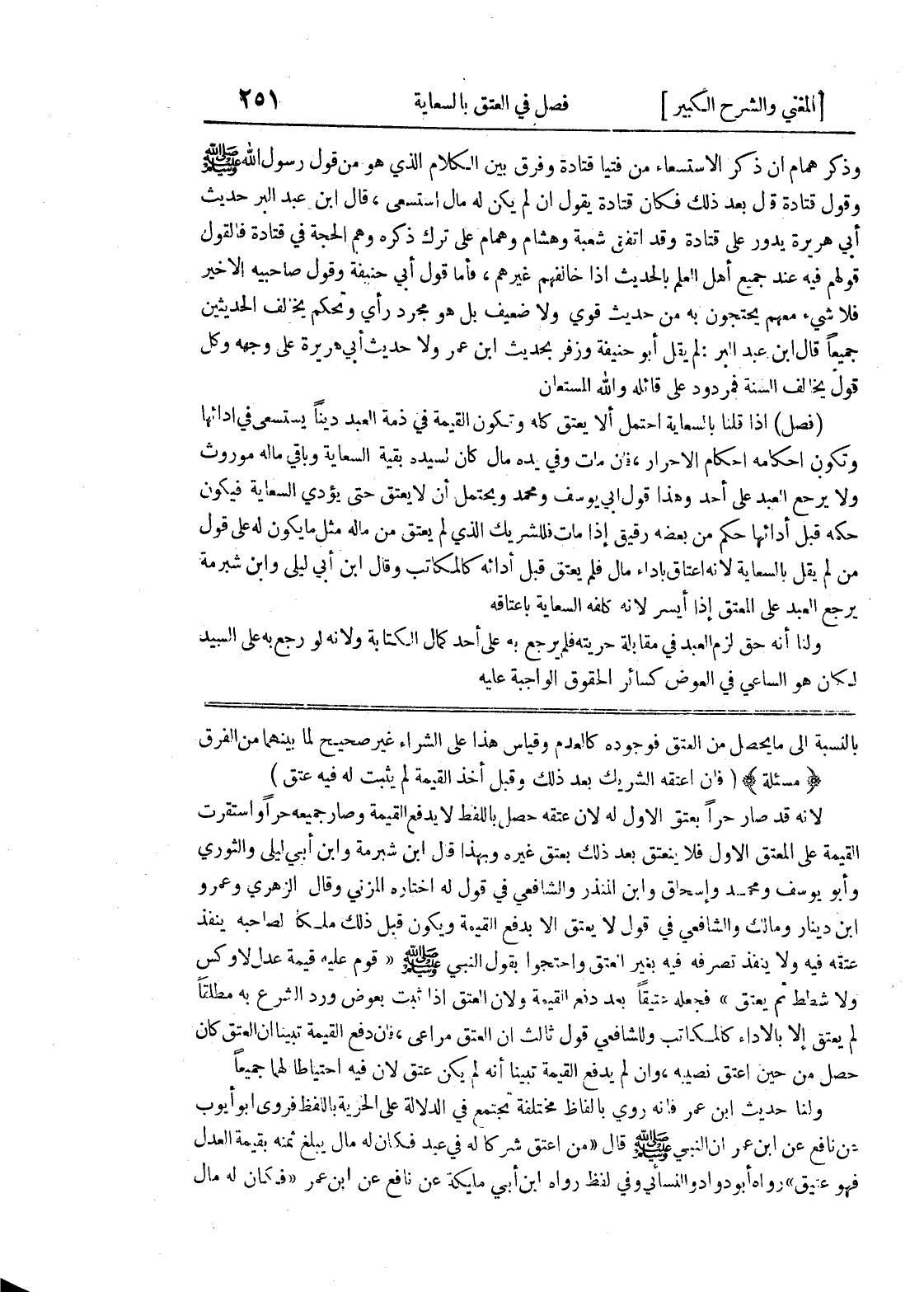 بالنسبة إلى ما يحصل من العتق فوجوده كالعدم وقياس هذا على الشراء غير صحيح لما بينهما من الفرق (مسألة) (فإن أعتقه الشريك بعد ذلك وقبل أخذ القيمة لم يثبت له فيه عتق) لأنه قد صار حراً بعتق الأول له لأن عتقه حصل باللفظ لا يدفع القيمة وصار جميعه حراً واستقرت القيمة على المعتق الأول فلا ينعتق بعد ذلك بعتق غيره وبهذا قال ابن شبرمة وابن أبي ليلى والثوري وأبو يوسف ومحمد وإسحاق وابن المنذر والشافعي في قول له اختاره المزني وقال الزهري وعمرو ابن دينار ومالك والشافعي في قول لا يعتق إلا بدفع القيمة ويكون قبل ذلك ملكاً لصاحبه ينفذ عتقه فيه ولا ينفذ تصرفه فيه بغير العتق واحتجوا بقول النبي صلى الله عليه وسلم (قوم عليه قيمة عدل لاوكس ولا شطط ثم يعتق) فجعله عتيقاً بعد دفع القيمة ولأن العتق إذا ثبت بعوض ورد الشرع به مطلقاً لم يعتق إلا بالاداء كالمكاتب وللشافعي قول ثالث أن العتق مراعى، فإن دفع القيمة تبينا أن العتق كان حصل من حين اعتق نصيبه، وإن لم يدفع القيمة تبينا أنه لم يكن عتق لأن فيه احتياطاً لهما جميعاً ولنا حديث ابن عمر فإنه روي بألفاظ مختلفة تجتمع في الدلالة على الحرية باللفظ فروى أبو أيوب عن نافع عن ابن عمر أن النبي صلى الله عليه وسلم قال (من أعتق شركا له في عبد فكان له مال يبلغ ثمنه بقيمة العدل فهو عتيق) رواه أبو داود والنسائي وفي لفظ رواه ابن أبي مليكة عن نافع عن ابن عمر (فكان له مال