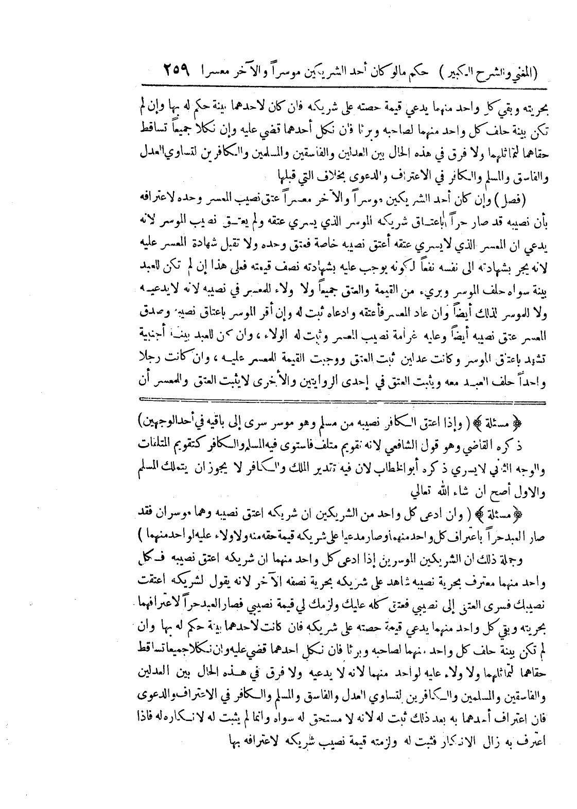 (مسألة) (وإذا أعتق الكافر نصيبه من مسلم وهو موسر سرى إلى باقيه في أحد الوجهين) ذكره القاضي وهو قول الشافعي لأنه تقويم متلف فاستوى فيه المسلم والكافر كتقويم المتلفات والوجه الثاني لا يسري ذكره أبو الخطاب لأن فيه تقدير الملك والكافر لا يجوز أن يتملك المسلم والأول أصح إن شاء الله تعالى (مسألة) (وإن إدعى كل واحد من الشريكين أن شريكه أعتق نصيبه وهما موسران فقد صار العبد حراً باعتراف كل واحد منهما وصار مدعياً على شريكه قيمة حقه منه ولا ولاء عليه لواحد منهما) وجملة ذلك أن الشريكين الموسرين إذا ادعى كل واحد منهما أن شريكه أعتق نصيبه فكل واحد منهما معترف بحرية نصيبه شاهد على شريكه بحرية نصفه الآخر لأنه يقول لشريكه اعتقت نصيبك فسرى العتق إلى نصيبي فعتق كله عليك ولزمك لي قيمة نصيبي فصار العبد حراً لاعترافهما بحريته وبقي كل واحد منهما يدعي قيمة حصته على شريكه فإن كانت لأحدهما بينة حكم له بها وإن لم تكن بينة حلف كل واحد منهما لصاحبه وبرئا فإن نكل أحدهما قضي عليه وإن نكلا جميعا تساقط حقاهما لتماثلهما ولا ولاء عليه لواحد منهما لأنه لا يدعيه ولا فرق في هذه الحال بين العدلين والفاسقين والمسلمين والكافرين لتساوي العدل والفاسق والمسلم والكافر في الاعتراف والدعوى