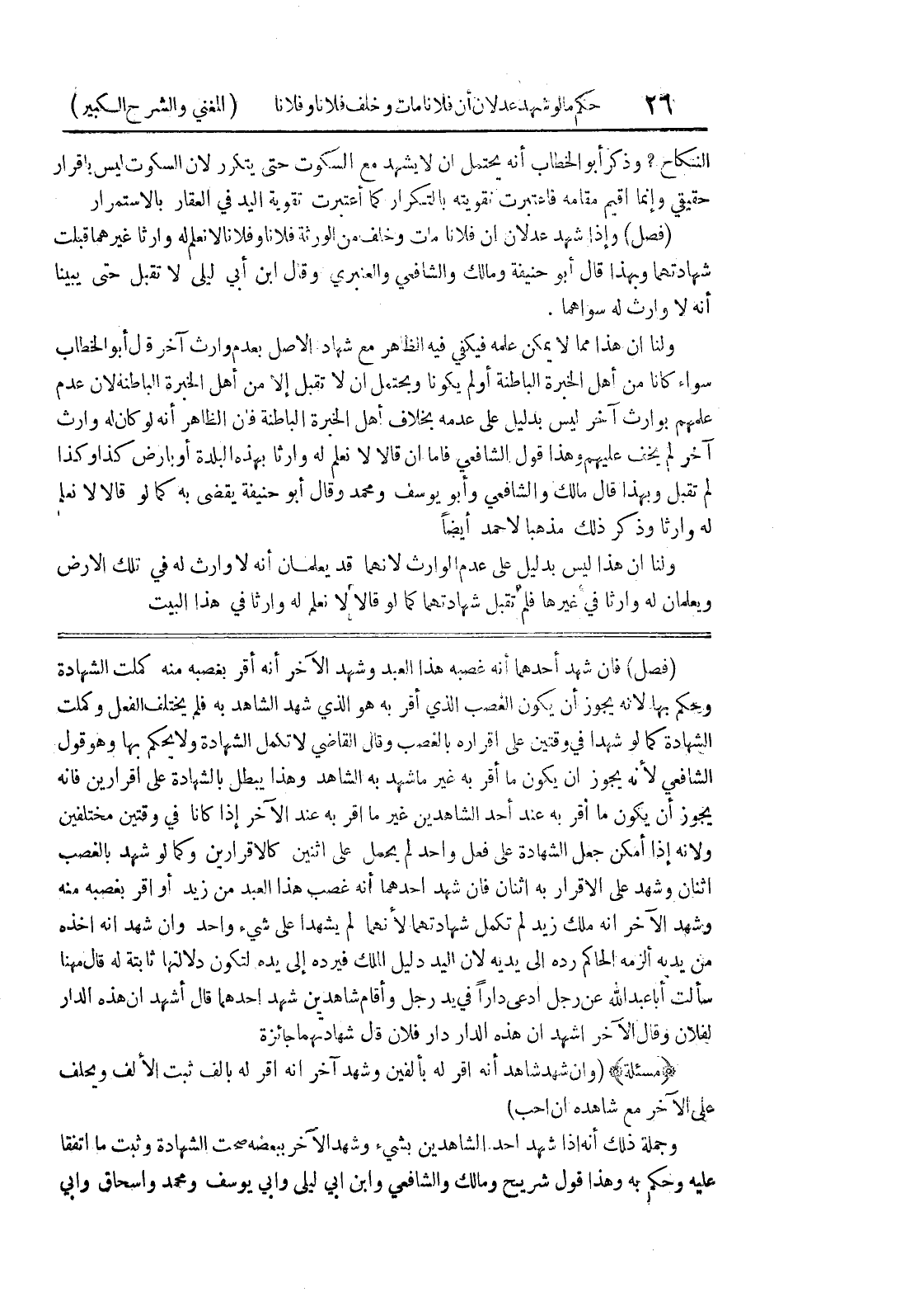 ولأنه إذا أمكن جعل الشهادة على فعل واحد لم يحمل على اثنين كالإقرارين وكما لو شهد بالغصب إثنان وشهد على الإقرار به إثنان فإن شهد أحدهما أنه غصب هذا العبد من زيد أو أقر بغصبه منه وشهد الآخر أنه ملك زيد لم تكمل شهادتهما لأنهما لم يشهدا على شئ واحد وإن شهد أنه اخذه من يديه ألزمه الحاكم رده إلى يديه لأن اليد دليل الملك فيرده إلى يده لتكون دلالتها ثابتة له قال مهنا سألت أبا عبد الله عن رجل ادعى داراً في يد رجل وأقام شاهدين شهد أحدهما قال أشهد أن هذه الدار لفلان وقال الآخر أشهد أن هذه الدار دار فلان قال شهادتهما جائزة (مسألة) (وإن شهد شاهد أنه أقر له بألفين وشهد آخر انه أقر له بألف ثبت الألف ويحلف على الآخر مع شاهده إن أحب) وجملة ذلك أنه إذا شهد احد الشاهدين بشئ وشهد الآخر ببعضه صحت الشهادة وثبت ما اتفقا عليه وحكم به وهذا قول شريح ومالك والشافعي وابن أبي ليلى وأبي يوسف ومحمد واسحاق وابي