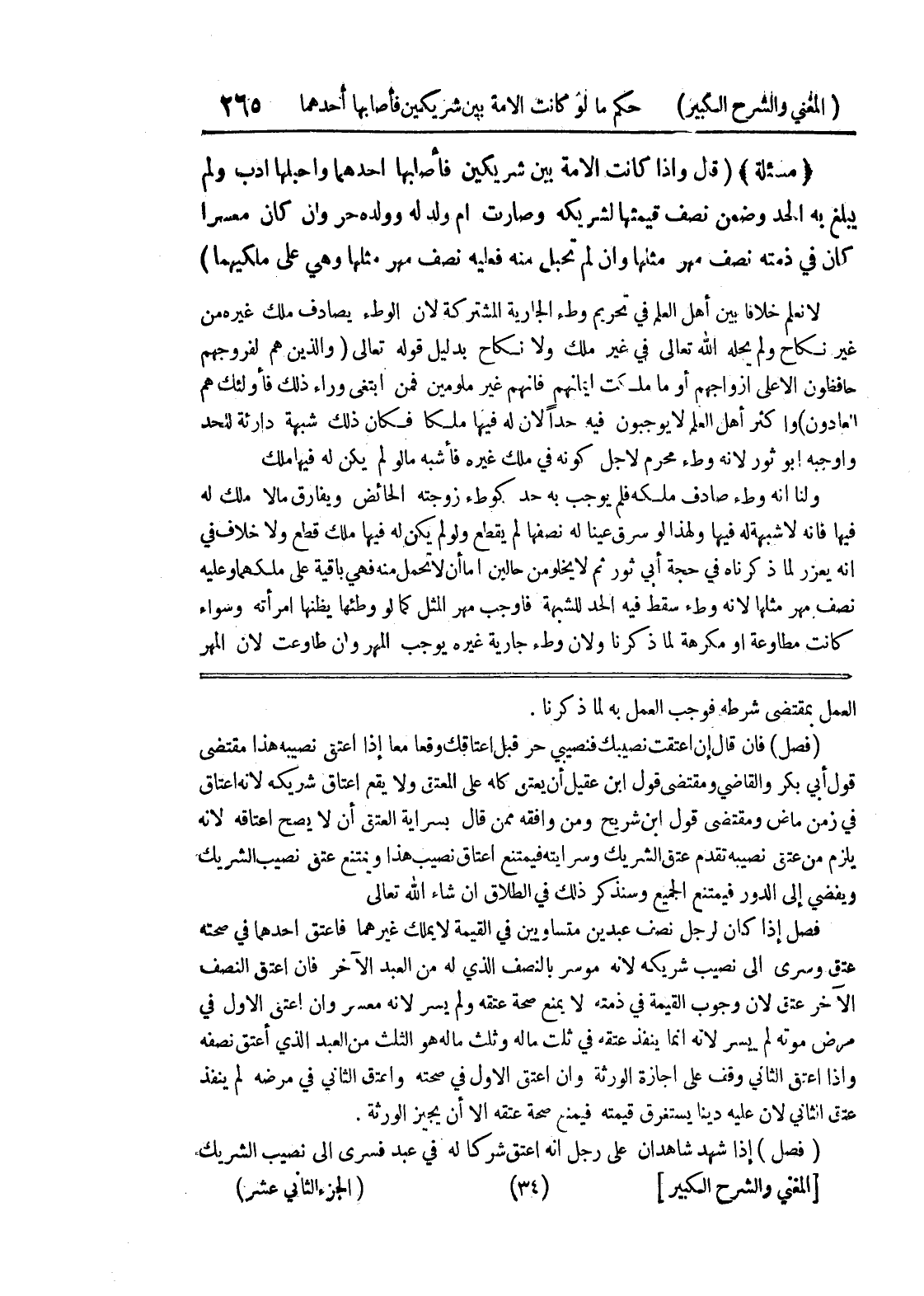 فصل إذا كان لرجل نصف عبدين متساويين في القيمة لا يملك غيرهما فأعتق أحدهما في صحته عتق وسرى إلى نصيب شريكه لانه موسر بالنصف الذي له من العبد الآخر فإن أعتق النصف الآخر عتق لأن وجوب القيمة في ذمته لا يمنع صحة عتقه ولم يسر لأنه معسر وإن أعتق الأول في مرض موته لم ييسر لأنه إنما ينفذ عتقه في ثلث ماله وثلث ماله هو الثلث من العبد الذي أعتق نصفه وإذا أعتق الثاني وقف على إجازة الورثة وإن أعتق الأول في صحته وأعتق الثاني في مرضه لم ينفذ عتق الثاني لأن عليه ديناً يستغرق قيمته فيمنع صحة عتقه إلا أن يجيز الورثة.