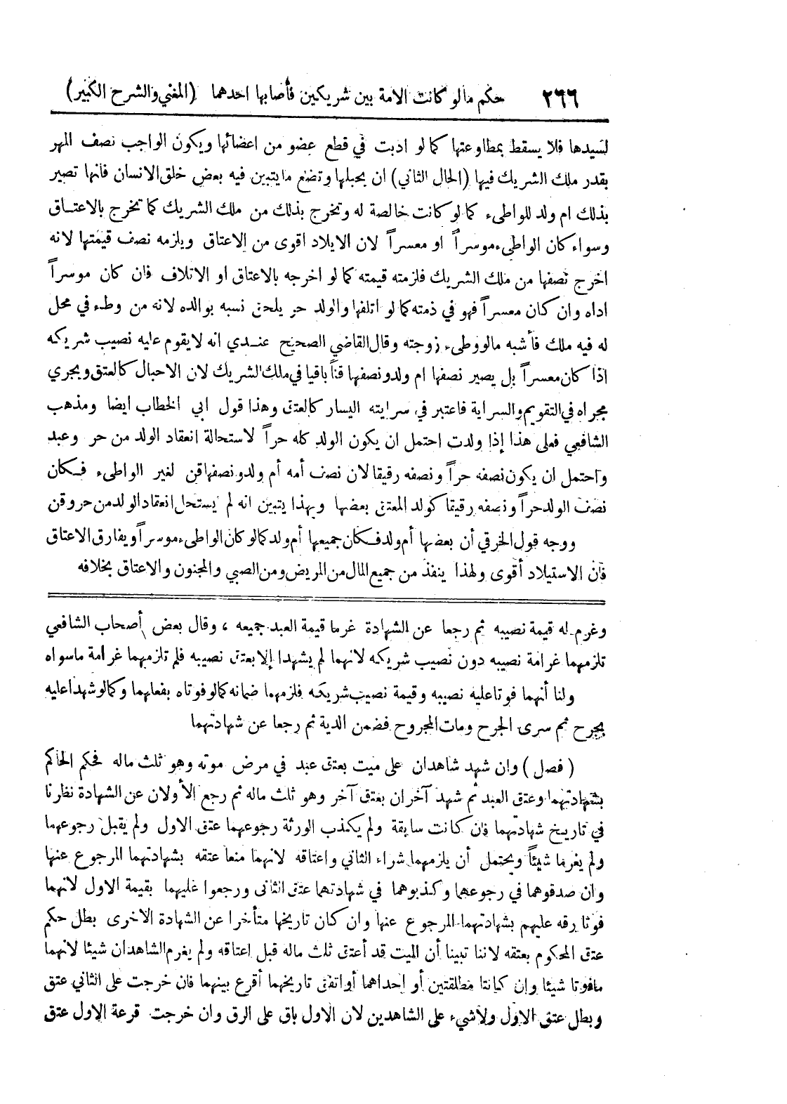 غرم له قيمة نصيبه ثم رجعا عن الشهادة غرما قيمة العبد جميعه، وقال بعض أصحاب الشافعي تلزمهما غرامة نصيبه دون نصيب شريكه لأنهما لم يشهدا إلا بعتق نصيبه فلم تلزمهما غرامة ما سواه ولنا أنهما فوتا عليه نصيبه وقيمة نصيب شريكه فلزمهما ضمانة كما لو فوتاه بفعلهما وكما لو شهدا عليه بجرح ثم سرى الجرح ومات المجروح فضمن الدية ثم رجعا عن شهادتهما (فصل) وإن شهد شاهدان على ميت بعتق عبد في مرض موته وهو ثلث ماله فحكم الحاكم بشهادتهما وعتق العبد ثم شهد آخران بعتق آخر وهو ثلث ماله ثم رجع الأولان عن الشهادة نظرنا في تاريخ شهدتهما فإن كانت سابقة ولم يكذب الورثة رجوعهما عتق الأول ولم يقبل رجوعهما ولم يغرما شيئاً ويحتمل أن يلزمهما شراء الثاني وإعتاقه لأنهما منعا عتقه بشهادتهما المرجوع عنها وإن صدقوهما في رجوعهما وكذبوهما في شهادتهما عتق الثاني ورجعوا عليهما بقيمة الأول لأنهما فوتا رقه عليهم بشهادتهما المرجوع عنها وإن كان تاريخها متأخراً عن الشهادة الأخرى بطل حكم عتق المحكوم بعتقه لأننا تبينا أن الميت قد أعتق ثلث ماله قبل إعتاقه ولم يغرم الشاهدان شيئاً لأنهما ما فوتا شيئا وإن كانتا مطلقتين أو إحداهما أو اتفق تاريخهما أقرع بينهما فإن خرجت على الثاني عتق وبطل عتق الأول ولا شئ على الشاهدين لأن الأول باق على الرق وإن خرجت قرعة الأول عتق