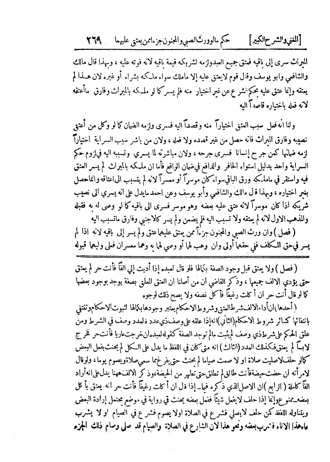 (فصل) ولا يعتق قبل وجود الصفة بكمالها فلو قال لعبده إذا أديت إلي ألفا فأنت حر لم يعتق حتى يؤدي الألف جميعها، وذكر القاضي أن من أصلنا أن العتق المعلق بصفة يوجد بوجود بعضها كما لو قال أنت حر إن أكلت رغيفاً فأكل نصفه ولا يصح ذلك لوجوه (أحدها) أن أداء الألف شرط العتق وشروط الأحكام يعتبر وجودها بكمالها لثبوت الاحكام وتنتفي بانتفائها كسائر شروط الاحكام (الثاني) أنه إذا علقه على وصف ذي عدد فالعدد وصف في الشرط ومن علق الحكم على شرط ذي وصف لم يثبت ما لم توجد الصفة كقوله لعبده إن خرجت عارياً فأنت حر فخرج لابساً لم يعتق فكذلك العدد (الثالث) أنه متى كان في اللفظ ما يدل على الكل لم يحنث بفعل البعض كما لو حلف لا صليت صلاة أو لا صمت صياماً لم يحنث حتى يفرغ مما سمي صلاة ويصوم يوماً، ولو قال لامرأته إن حضت حيضة فأنت طالق لم تطلق حتى تطهر من الحيضة، وذكر الألف ههنا يدل على أنه أراد الفاً كاملة (الرابع) ان الأصل الذي ذكره فيما - إذا قال إن أكلت رغيفاً فأنت حر أنه يعتق بأكل بعضه - ممنوع وإنما إذا حلف لا يفعل شيئاً ففعل بعضه يحنث في رواية في موضع يحتمل إرادة البعض ويتناوله اللفظ كمن حلف لا يصلي فشرع في الصلاة أو لا يصوم فشرع في الصيام أو لا يشرب