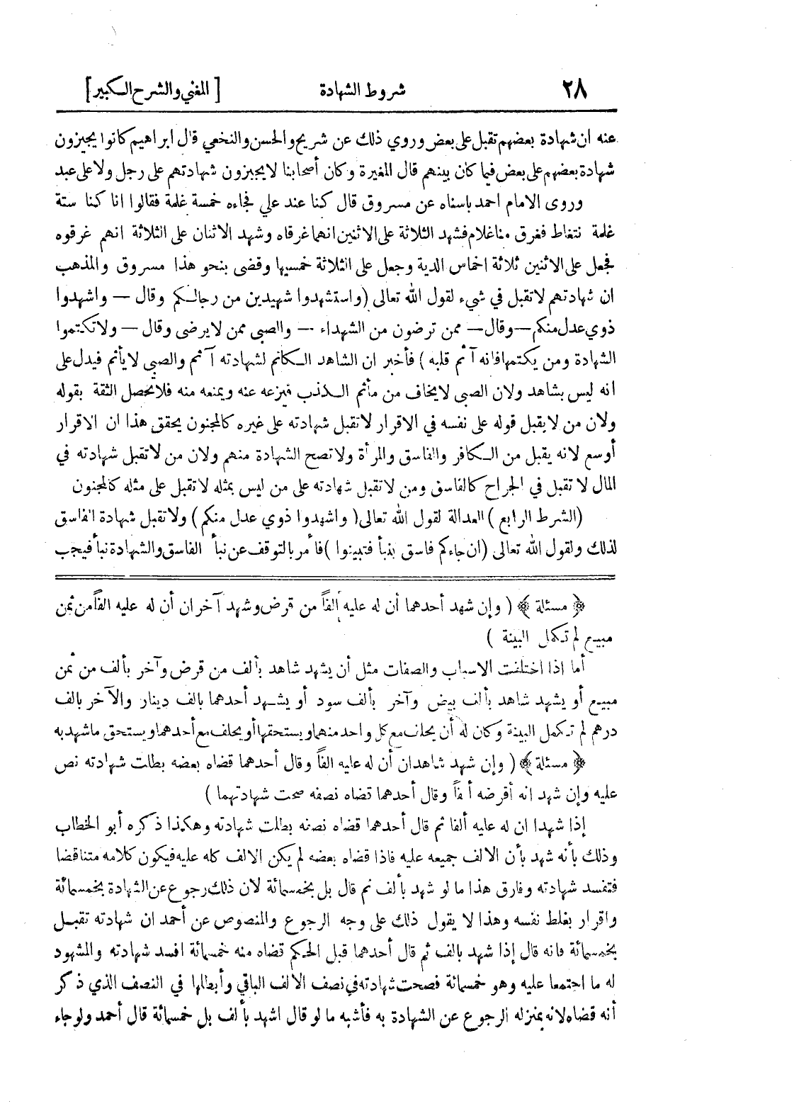 (مسألة) (وإن شهد أحدهما أن له عليه ألفاً من قرض وشهد آخران أن له عليه ألفاً من ثمن مبيع لم تكمل البينة) أما إذا اختلفت الأسباب والصفات مثل أن يشهد شاهد بألف من قرض وآخر بألف من ثمن مبيع أو يشهد شاهد بألف بيض وآخر بألف سود أو يشهد أحدهما بألف دينار والآخر بألف درهم لم تكمل البينة وكان له أن يحلف مع كل واحد منهما ويستحقها أو يحلف مع أحدهما ويستحق ما شهد به (مسألة) (وإن شهد شاهدان أن له عليه ألفاً وقال أحدهما قضاه بعضه بطلت شهادته نص عليه وإن شهد أنه أقرضه ألفاً وقال أحدهما قضاه نصفه صحت شهادتهما) إذا شهدا أن له عليه ألفاً ثم قال أحدهما قضاه نصفه بطلت شهادته وهكذا ذكره أبو الخطاب وذلك بأنه شهد بأن الألف جميعه عليه فإذا قضاه بعضه لم يكن الألف كله عليه فيكون كلامه متناقضاً فتفسد شهادته وفارق هذا ما لو شهد بألف ثم قال بل بخمسمائة لأن ذلك رجوع عن الشهادة بخمسمائة وإقرار بغلط نفسه وهذا لا يقول ذلك على وجه الرجوع والمنصوص عن أحمد أن شهادته تقبل بخمسمائه فإنه قال إذا شهد بألف ثم قال أحدهما قبل الحكم قضاه منه خمسمائه أفسد شهادته والمشهود له ما اجتمعا عليه وهو خمسمائه فصحت شهادته في نصف الألف الباقي وأبطلها في النصف الذي ذكر أنه قضاه لأنه بمنزلة الرجوع عن الشهادة به فأشبه ما لو قال أشهد بألف بل خمسمائه قال أحمد ولو جاء