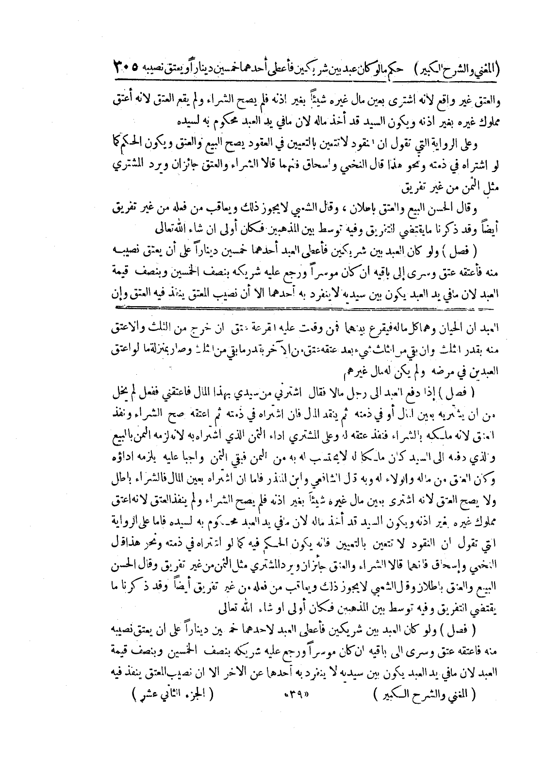 العبد ان الحيان وهما كل ما له فيقرع بينهما فمن وقعت عليه القرعة عتق إن خرج من الثلث وإلا عتق منه بقدر الثلث وإن بقي من الثلث شئ بعد عتقه عتق من الآخر بقدر ما بقي من الثلث وصار بمنزلة ما لو أعتق العبدين في مرضه ولم يكن له مال غيرهم (فصل) إذا دفع العبد إلى رجل مالاً فقال اشترني من سيدي بهذا المال فأعتقني ففعل لم يخل من أن يشتريه بعين المال أو في ذمته ثم ينقد المال فإن اشتراه في ذمته ثم أعتقه صح الشراء ونفذ العتق لأنه ملكه بالشراء فنفذ عتقه له وعلى المشتري أداء الثمن الذي اشتراه به لأنه لزمه الثمن بالبيع والذي دفعه إلى السيد كان ملكاً له لا يحتسب له به من اليمن فبقي الثمن واجباً عليه يلزمه اداؤه وكان العتق من ماله والولاء له وبه قال الشافعي وابن المنذر فأما إن اشتراه بعين المال فالشراء باطل ولا يصح العتق لأنه اشترى بعين مال غيره شيئاً بغير إذنه فلم يصح الشراء ولم ينفذ العتق لأنه اعتق مملوك غيره بغير إذنه ويكون السيد قد أخذ ماله لأن ما في يد العبد محكوم به لسيده فأما على الرواية التي تقول إن النقود لا تتعين بالتعيين فإنه يكون الحكم فيه كما لو اشتراه في ذمته ونحو هذا قال