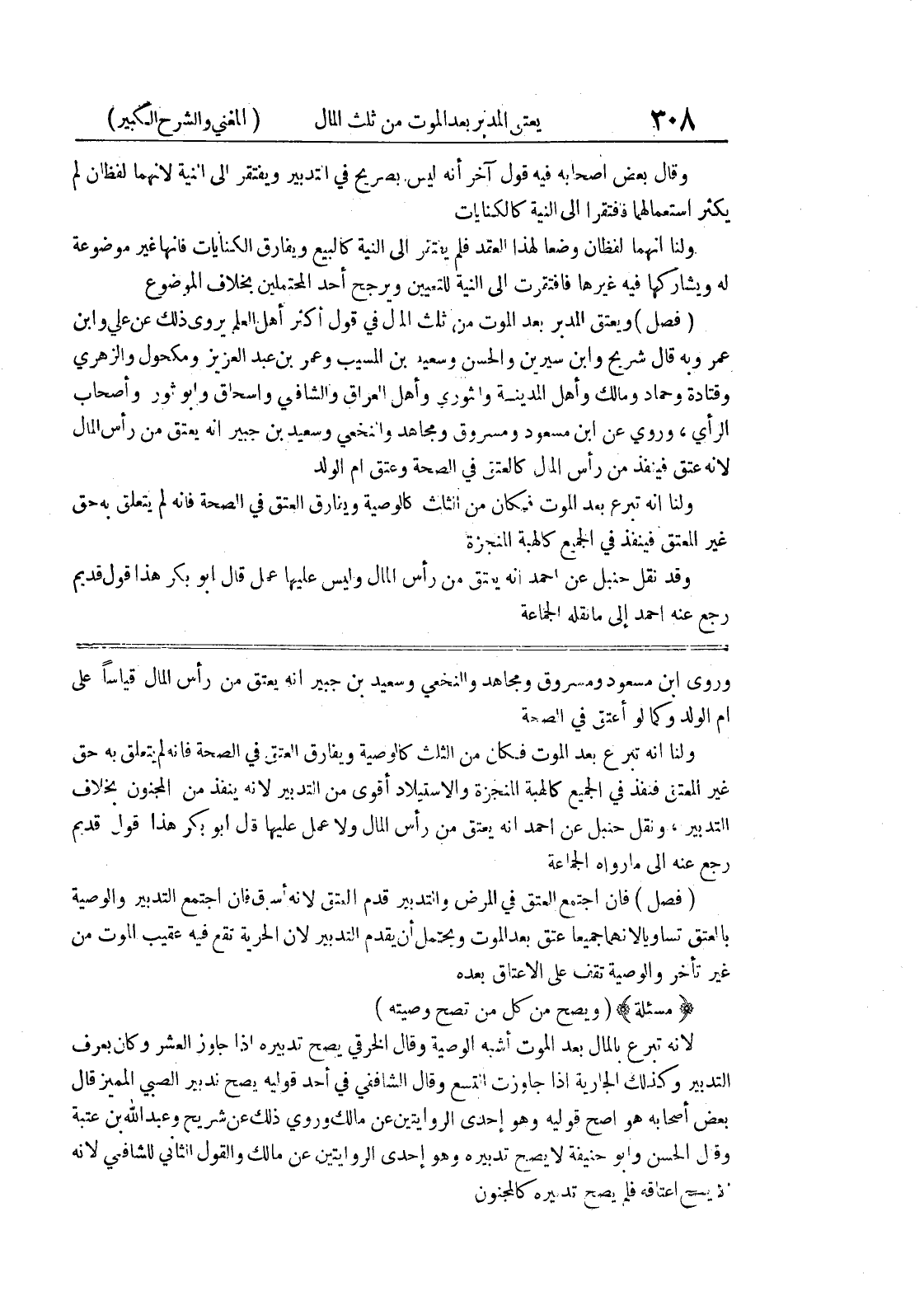 وروى ابن مسعود ومسروق ومجاهد والنخعي وسعيد بن جبير أنه يعتق من رأس المال قياساً على أم الولد وكما لو أعتق في الصحة ولنا أنه تبرع بعد الموت فكان من الثلث كالوصية ويفارق العتق في الصحة فإنه لم يتعلق به حق غير المعتق فنفذ في الجميع كالهبة المنجزة والاستيلاد أقوى من التدبير لأنه ينفذ من المجنون بخلاف التدبير، ونقل حنبل عن أحمد أنه يعتق من رأس المال ولا عمل عليها قال أبو بكر هذا قول قديم رجع عنه إلى ما رواه الجماعة (فصل) فإن اجتمع العتق في المرض والتدبير قدم العتق لأنه أسبق فإن اجتمع التدبير والوصية بالعتق تساويا لأنهما جميعاً عتق بعد الموت ويحتمل أن يقدم التدبير لأن الحرية تقع فيه عقيب الموت من غير تأخر والوصية تقف على الإعتاق بعده (مسألة) (ويصح من كل من تصح وصيته) لأنه تبرع بالمال بعد الموت أشبه الوصية وقال الخرقي يصح تدبيره إذا جاوز العشر وكان بعرف