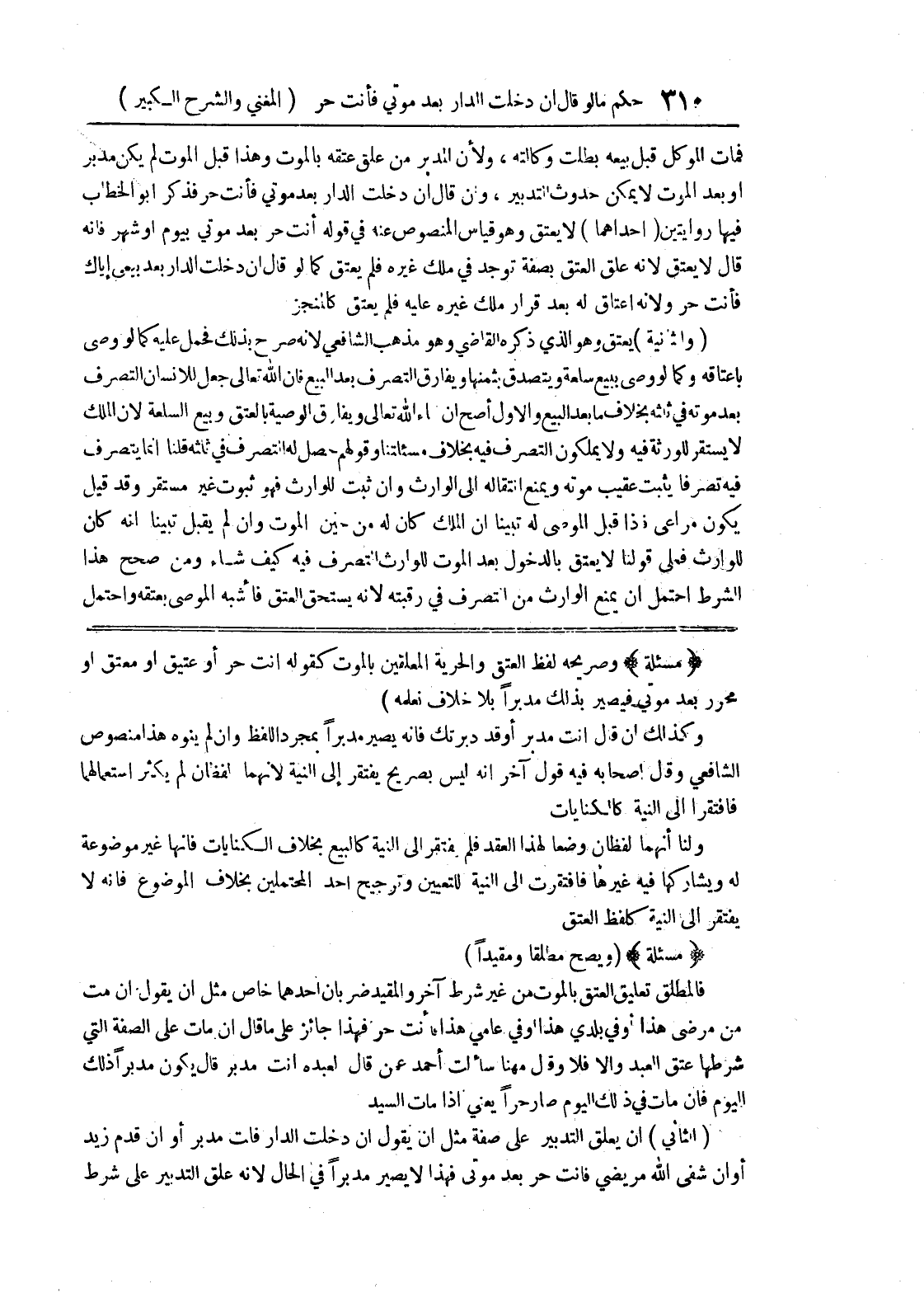 وكذلك إن قال أنت مدبر أو قد دبرتك فإنه يصير مدبراً بمجرد اللفظ وإن لم ينوه هذا منصوص الشافعي وقال أصحابه فيه قول آخر إنه ليس بصريح يفتقر إلى النية لأنهما لفظان لم يكثر استعمالهما فافتقرا إلى النية كالكنايات ولنا أنهما لفظان وضعا لهذا العقد فلم يفتقر إلى النية كالبيع بخلاف الكنايات فإنها غير موضوعة له ويشاركها فيه غيرها فافتقرت إلى النية للتعيين وترجيح أحد المحتملين بخلاف الموضوع فإنه لا يفتقر إلى النية كلفظ العتق (مسألة) (ويصح مطلقاً ومقيداً) فالمطلق تعليق العتق بالموت من غير شرط آخر والمقيد ضربان أحدهما خاص مثل أن يقول إن مت من مرضي هذا أو في بلدي هذا أو في عامي هذا فأنت حر فهذا جائز على ما قال إن مات على الصفة التي شرطها عتق العبد وإلا فلا وقال مهنا سألت أحمد عمن قال لعبده أنت مدبر قال يكون مدبراً ذلك اليوم فإن مات في ذلك اليوم صار حراً يعني إذا مات السيد (الثاني) أن يعلق التدبير على صفة مثل أن يقول إن دخلت الدار فلت مدبر أو إن قدم زيد أو إن شفى الله مريضي فأنت حر بعد موتي فهذا لا يصير مدبراً في الحال لأنه علق التدبير على شرط