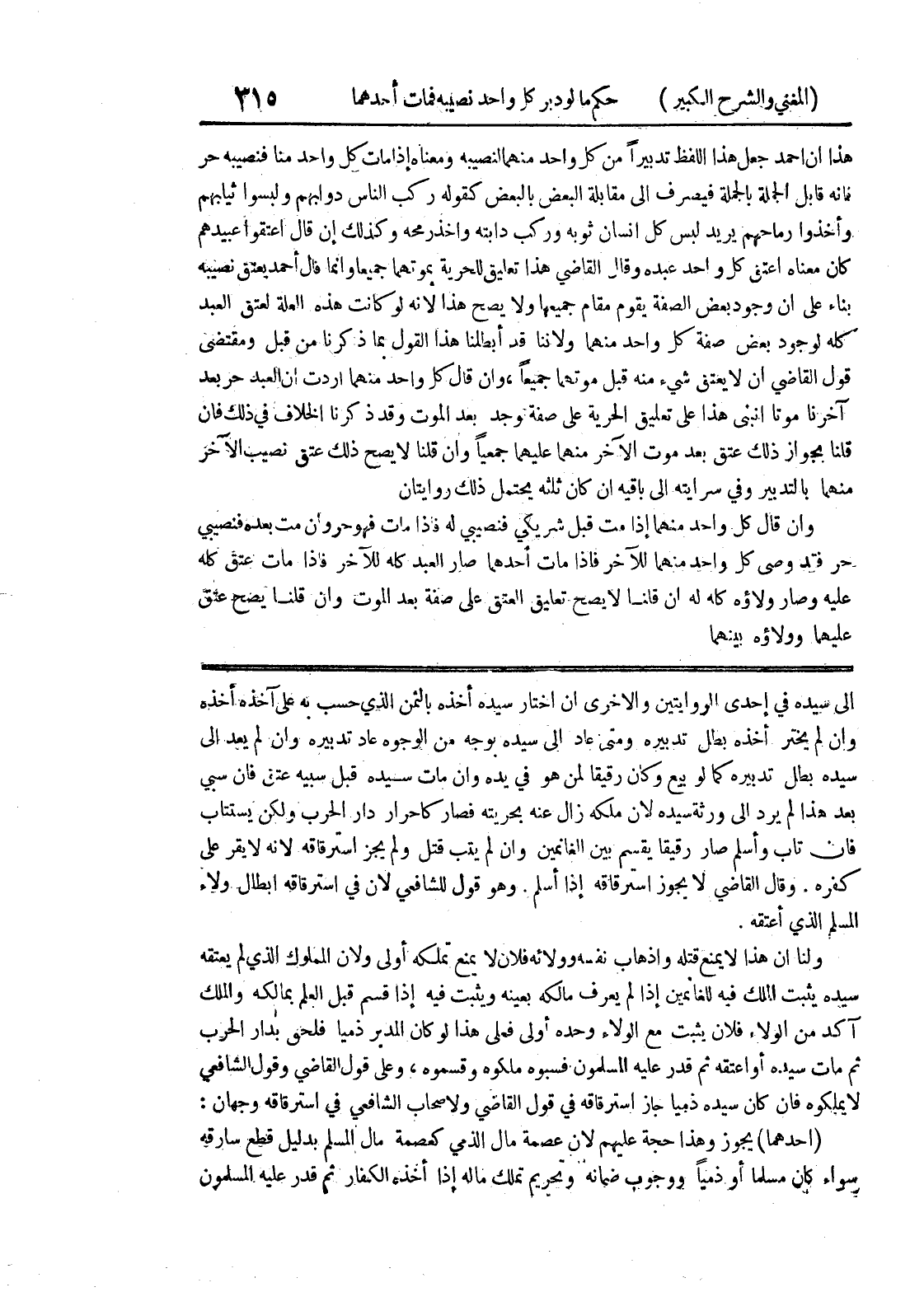 وهو قول للشافعي لأن في استرقاقه إبطال ولاء المسلم الذي أعتقه ولنا أن هذا لا يمنع قتله وإذهاب نفسه وولائه لا يمنع تملكه أولى ولأن المملوك الذي لم يعتقه سيده يثبت الملك فيه للغانمين إذا لم يعرف مالكه بعينه ويثبت فيه إذا قسم قبل العلم بمالكه والملك آكد من الولاء فلأن يثبت مع الولاء وحده أولى فعلى هذا لو كان المدبر ذمياً فلحق بدار الحرب ثم مات سيده أو أعتقه ثم قدر عليه المسلمون فسبوه ملكوه وقسموه، وعلى قول القاضي وقول الشافعي لا يملكوه فإن كان سيده ذمياً جاز استرقاقه في قول القاضي ولأصحاب الشافعي في استرقاقه وجهان: (أحدهما) يجوز وهذا حجة عليهم لأن عصمة مال الذمي كعصمة مال المسلم بدليل قطع سارقه سواء كان مسلماً أو ذمياً ووجوب ضمانه وتحريم تملك ماله إذا أخذه الكفار ثم قدر عليه المسلمون