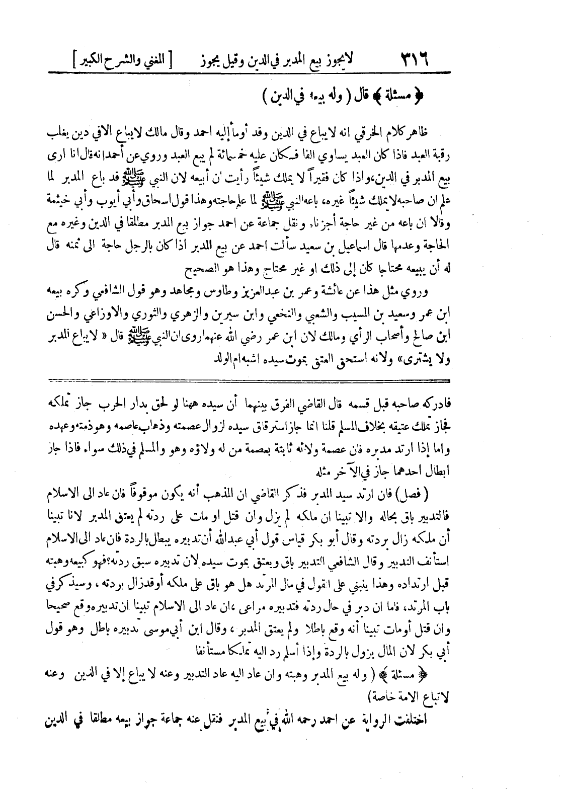 فأدركه صاحبه قبل قسمه قال القاضي الفرق بينهما أن سيده ههنا لو لحق بدار الحرب جاز تملكه فجاز تملك عتيقه بخلاف المسلم قلنا إنما جاز استرقاق سيده لزوال عصمته وذهاب عاصمه وهو ذمته وعهده وأما إذا ارتد مدبره فإن عصمة ولائه ثابته بعصمة من له ولاؤه وهو والمسلم في ذلك سواء فإذا جاز إبطال أحدهما جاز في الآخر مثله (فصل) فإن ارتد سيد المدبر فذكر القاضي أن المذهب أنه يكون موقوفاً فإن عاد إلى الإسلام فالتدبير باق بحاله وإلا تبينا أن ملكه لم يزل وإن قتل أو مات على ردته لم يعتق المدبر لأنا تبينا أن ملكه زال بردته وقال أبو بكر قياس قول أبي عبد الله أن تدبيره يبطل بالردة فإن عاد إلى الإسلام استأنف التدبير وقال الشافعي التدبير باق ويعتق بموت سيده لأن تدبيره سبق ردته؟ فهو كبيعه وهبته قبل ارتداده وهذا ينبني على القول في مال المرتد هل هو باق على ملكه أو قد زال بردته، وسيذكر في باب المرتد، فأما إن دبر في حال ردته فتدبيره مراعى، وإن عاد إلى الإسلام تبينا أن تدبيره وقع صحيحاً وإن قتل أو مات تبينا أنه وقع باطلاً ولم يعتق المدبر، وقال ابن أبي موسى تدبيره باطل وهو قول أبي بكر لأن المال يزول بالردة وإذا أسلم رد إليه تملكاً مستأنفاً (مسألة) (وله بيع المدبر وهبته وإن عاد إليه عاد التدبير وعنه لا يباع إلا في الدين وعنه لاتباع الأمة خاصة) اختلفت الرواية عن أحمد رحمه الله في بيع المدبر فنقل عنه جماعة جواز بيعه مطلقاً في الدين
