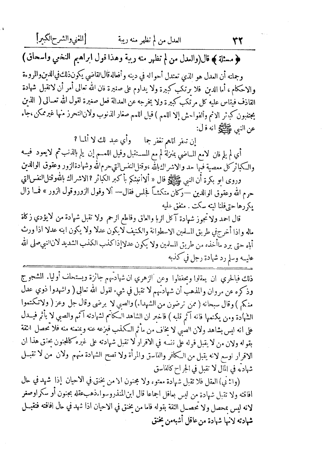 الاقرار اوسع لأنه يقبل من الكافر والفاسق والمرأة ولا تصح الشهادة منهم ولأن من لا تقبل شهادته في المال لا تقبل في الجراح كالفاسق (والثاني) العقل فلا تقبل شهادة معتوه ولا مجنون إلا من يخنق في الاحيان إذا شهد في حال إفاقته ولا تقبل شهادة من ليس بعاقل إجماعاً قال إبن المنذر وسواء ذهب عقله بجنون أو سكر أو صغر لأنه ليس بمحصل ولا تحصل الثقة بقوله فأما من يخنق في الاحيان إذا شهد في حال إفاقته فتقبل شهادته لأنها شهادة من عاقل أشبه من يخنق