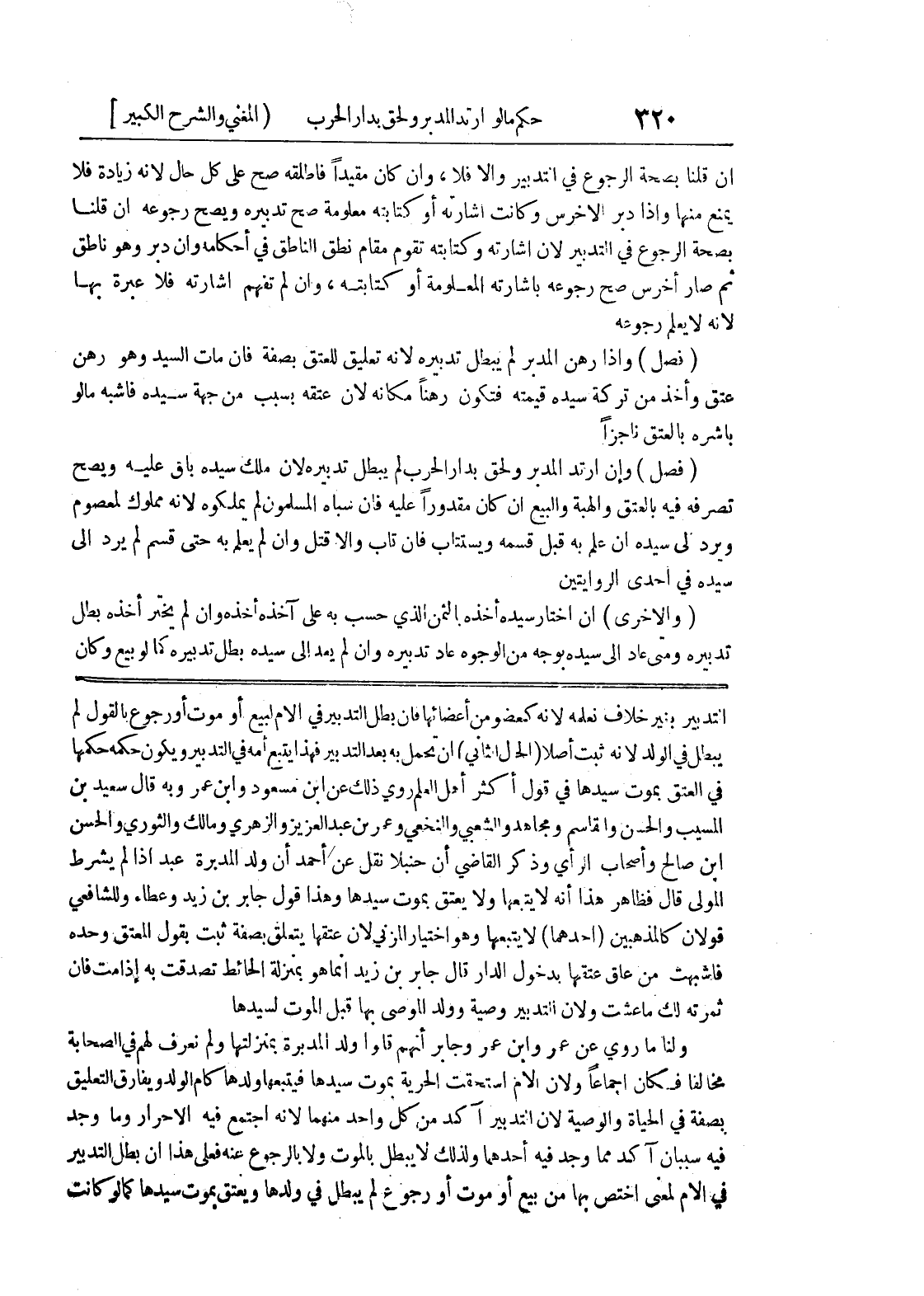 التدبير بغير خلاف لأنه كعضور من أعضائها فإن بطل التدبير في الأم لبيع أو موت أو رجوع بالقول لم يبطل في الولد لأنه ثبت أصلاً (الحال الثاني) أن تحمل به بعد التدبير فهذا يتبع أمه في التدبير ويكون حكمه حكمها في العتق بموت سيدها في قول أكثر أهل العلم روي ذلك عن ابن مسعود وابن عمر وبه قال سعيد بن المسيب والحسن والقاسم ومجاهد والشعبي والنخعي وعمر بن عبد العزيز والزهري ومالك والثوري والحمن ابن صالح وأصحاب الرأي وذكر القاضي أن حنبلاً نقل عن أحمد أن ولد المدبرة عبد إذا لم يشرط