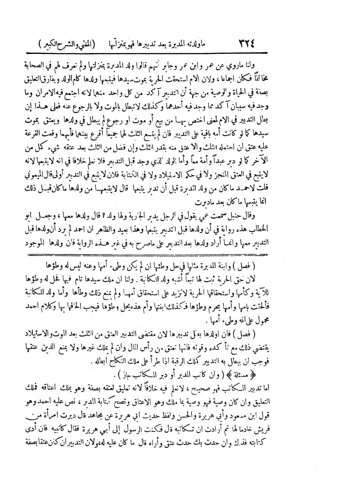 (فصل) وابنة المدبرة مثلها في حل وطئها إن لم يكن وطئ أمها وعنه ليس له وطؤها لأن حق الحرية ثبت لها تبعاً أشبه ولد المكاتبة ولنا أن ملك سيدها تام فيها فحل له وطؤها للآية وكأمها واستحقاقها الحرية لا تزيد على استحقاق أمها ولم يمنع ذلك وطأها وأما ولد المكاتبة فألحقت بأمها وأمها يحرم وطؤها فكذلك ابنتها وأم هذه يحل وطؤها فيجب إلحاقها بها وكلام أحمد محمول على أنه وطئ أمها.
