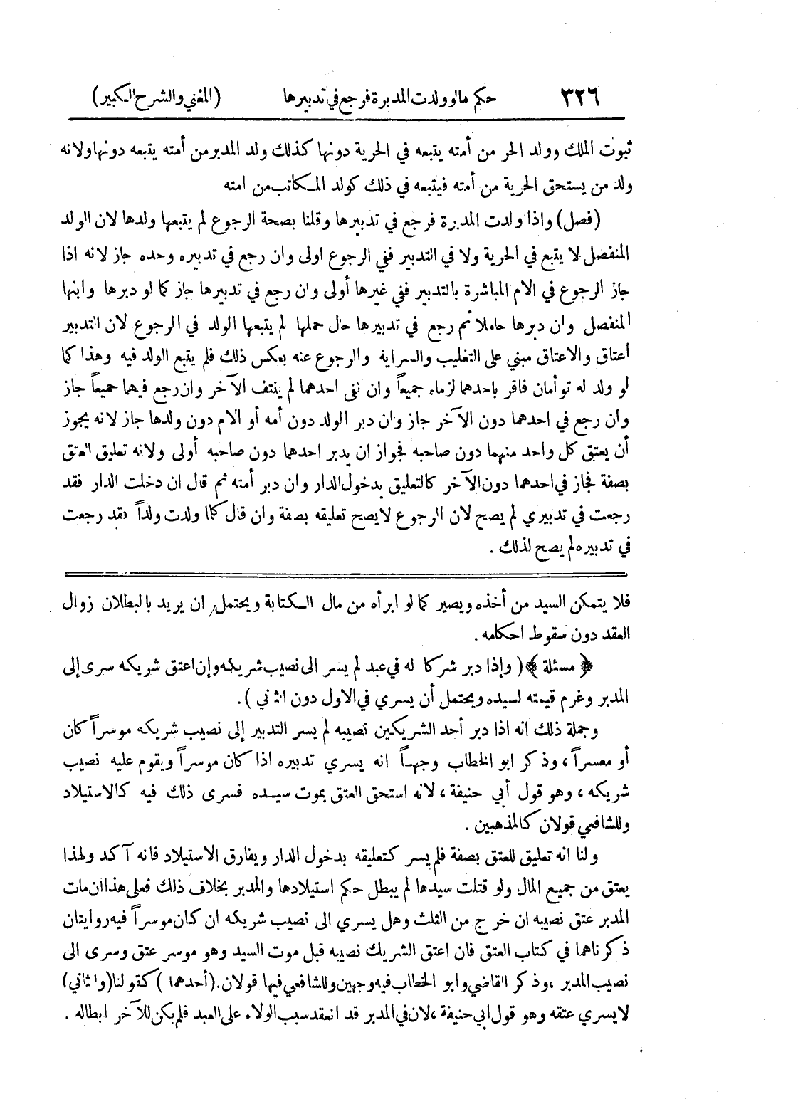 ولنا أنه تعليق للعتق بصفة فلم يسر كتعليقه بدخول الدار ويفارق الاستيلاد فإنه آكد ولهذا يعتق من جميع المال ولو قتلت سيدها لم يبطل حكم استيلادها والمدبر بخلاف ذلك فعلى هذا إن مات المدبر عتق نصيبه أن خرج من الثلث وهل يسري إلى نصيب شريكه إن كان موسراً فيه روايتان ذكرناهما في كتاب العتق فإن أعتق الشريك نصيبه قبل موت السيد وهو موسر عتق وسرى إلى نصيب المدبر، وذكر القاضي وابو الخطاب فيه وجهين وللشافعي فيها قولان.