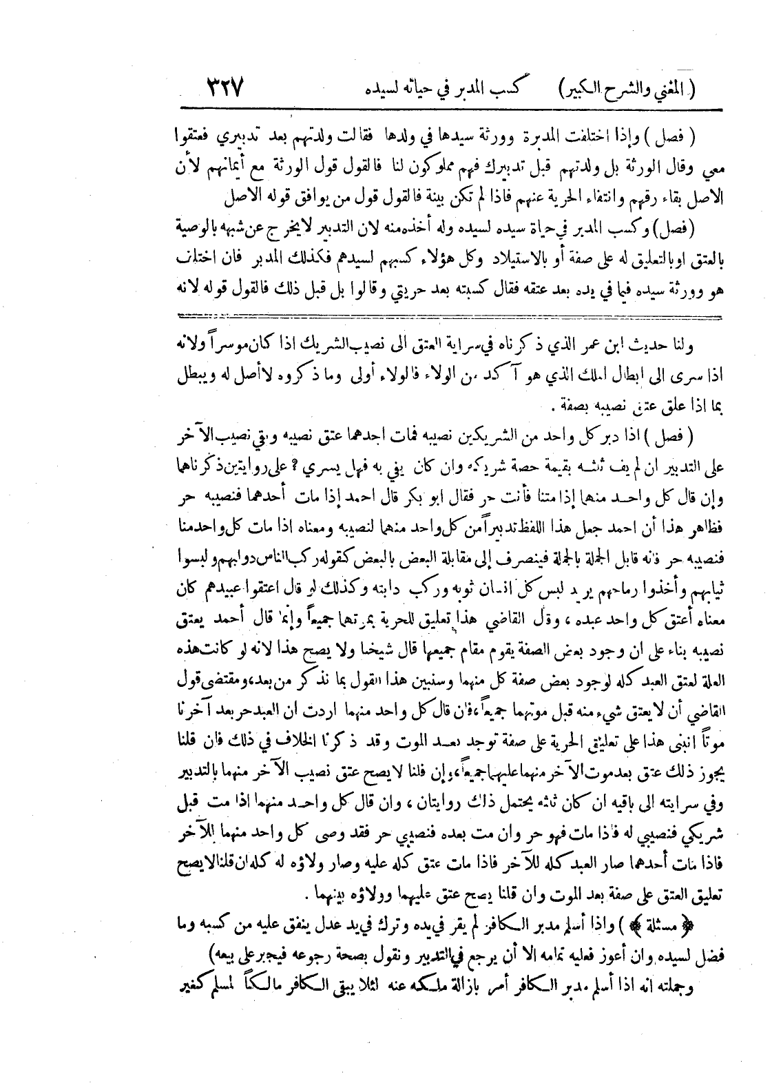 العلة لعتق العبد كله لوجود بعض صفة كل منهما وسنبين هذا القول بما نذكر من بعد، ومقتضي قول القاضي أن لا يعتق شئ منه قبل موتهما جميعاً، فأن قال كل واحد منهما أردت أن العبد حر بعد آخرنا موتاً انبنى هذا على تعليق الحرية على صفة توجد بعد الموت وقد ذكرنا الخلاف في ذلك فإن قلنا يجوز ذلك عتق بعد موت الآخر منهما عليهما جميعاً، وإن فلنا لا يصح عتق نصيب الآخر منهما بالتدبير وفي سرايته إلى باقيه إن كان ثلثه يحتمل ذلك روايتان، وإن قال كل واحد منهما إذا مت قبل شريكي فنصيبي له فإذا مات فهو حر وإن مت بعده فنصيبي حر فقد وصى كل واحد منهما للآخر فإذا مات أحدهما صار العبد كله للأخر فإذا مات عتق كله عليه وصار ولاؤه له كله إن قلنا لا يصح تعليق العتق على صفة بعد الموت وإن قلنا يصح عتق عليهما وولاؤه بينهما.