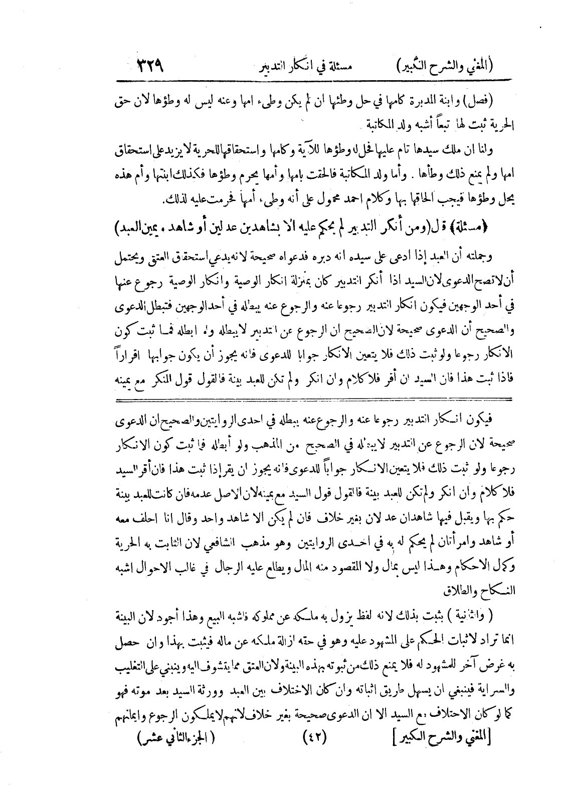فيكون انكار التدبير رجوعاً عنه والرجوع عنه يبطله في إحدى الروايتين والصحيح أن الدعوى صحيحة لأن الرجوع عن التدبير لا يبطله في الصحيح من المذهب ولو أبطله فما ثبت كون الإنكار رجوعاً ولو ثبت ذلك فلا يتعين الانكار جواباً للدعوى فإنه يجوز أن يقرا إذا ثبت هذا فإن أقر السيد فلا كلام وإن أنكر ولم تكن للعبد بينة فالقول قول السيد مع يمينه لأن الأصل عدمه فإن كانت للعبد بينة حكم بها ويقبل فيها شاهدان عدلان بغير خلاف فإن لم يكن إلا شاهد واحد وقال أنا أحلف معه أو شاهد وامرأتان لم يحكم له به في إحدى الروايتين وهو مذهب الشافعي لأن الثابت به الحرية وكمال الأحكام وهذا ليس بمال ولا المقصود منه المال ويطلع عليه الرجال في غالب الأحوال أشبه النكاح والطلاق (والثانية) بثبت بذلك لأنه لفظ يزول به ملكه عن مملوكه فاشبه البيع وهذا أجود لأن البينة إنما تراد لأثبات الحكم على المشهود عليه وهو في حقه إزالة ملكه عن ماله فيثبت بهذا وإن حصل به غرض آخر للمشهود له فلا يمنع ذلك من ثبوته بهذه البينة ولأن العتق مما يتشوف إليه وينبني على التغليب والسراية فينبغي أن يسهل طريق إثباته وإن كان الاختلاف بين العبد وورثة السيد بعد موته فهو كما لو كان الاحتلاف مع السيد إلا أن الدعوى صحيحة بغير خلاف لأنهم لا يملكون الرجوع وإيمانهم