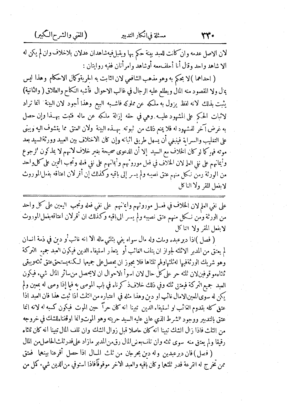 (فصل) إذا دبر عبده ومات وله مال سواه يفي بثلثي ماله إلا أنه غائب أو دين في ذمة إنسان لم يعتق من المدبر إلا ثلثه لجواز أن يتلف الغائب أو يتعذر استيفاء الدين فيكون العبد جميع التركة وهو شريك الورثة فيها له ثلثها ولهم ثلثاها فلا يجوز أن يحصل على جميعها لكنه يستحق عتق ثلثه ويبقى ثلثاه موقوفين لأن ثلثه حر على كل حال لأن اسوأ الاحوال أن لا يحصل من سائر المال شئ فيكون العبد جميع التركة فيعتق ثلثه وفي ذلك خلاف ذكرناه في باب الموصي به فيما إذا وصى له بمعين ولم يكن له سوى المعين إلا مال غائب أو دين وهذا مثله في اعتباره من الثلث إذا ثبت هذا فإن العبد إذا عتق كله بقدوم الغائب أو استيفاء الدين تبينا أنه كان حراً حين الموت فيكون كسبه له لأنه إنما عتق بالتدبير ووجود الشرط الذي علق عليه السيد حريته وهو الموت وإنما أوقفناه للشك في خروجه من الثلث فإذا زال الشك تبينا أنه كان حاصلاً قبل زوال الشك وإن تلف المال تبينا أنه كان ثلثاه رقيقاً ولم يعتق منه سوى ثلثه وإن تلف بعض المال رق من المدبر ما زاد على قدر ثلث الحاصل من المال (فصل) فإن دبر عبدين وله دين يحرجان من ثلث المال إذا حصل أقرعنا بينهما فعتق ممن تخرج له القرعة قدر ثلثهما وكان باقيه والعبد الاخر موقوفاً فإذا استوفي من الدين شئ كمل من