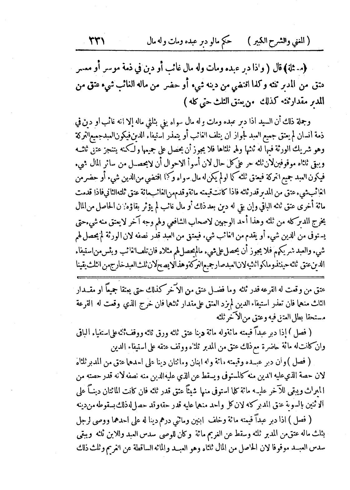 (فصل) إذا دبر عبداً قيمته مائة وخلف ابنين ومائتي درهم ديناً له على أحدهما ووصى لرجل بثلث ماله عتق من المدبر ثلثه وسقط عن الغريم مائة وكان للوصي سدس العبد وللابن ئلثه ويبقى سدس العبد موقوفاً لأن الحاصل من المال ثلثاه وهو العبد والمائة الساقطة عن الغريم وثلث ذلك