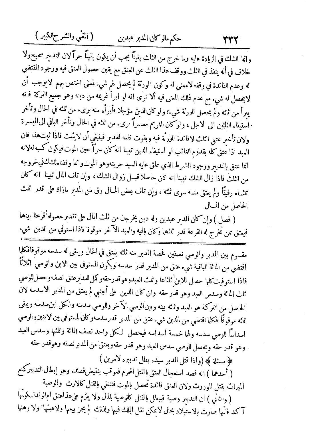مقسوم بين المدبر والوصي نصفين فحصة المدبر منه ثلثه يعتق في الحال ويبقى له سدسه موقوفاً فكلما اقتضي من المائة الباقية شئ عتق من المدبر قدر سدسه ويكون المستوفي بين الابن والوصي أثلاثاً فإذا استوفيت كلها حصل للابن ثلثاها وثلث العبد وهو قدر حقه وكمل للمدبر عتق نصفه وحصل للوصي ثلث المائة وسدس العبد وهو قدر حقه وإن كان الدين على أجنبي لم يعتق من المدبر إلا سدسه لأن الحاصل من التركة هو العبد وثلثه بينه وبين الوصي الآخر وللوصي سدسه ولكل ابن سدسه ويبقى ثلثه موقوفاً فكلما اقتضي من الدين شئ عتق من المدبر قدر سدسه وكان المستوفى بين الابنين والوصي أسداساً للوصي سدسه ولهما خمسة أسداسه فيحصل لكل واحد نصف المائة وثلثها وسدس العبد وهو قدر حقه ويحصل للوصي سدس العبد وهو قدر حقه ويعتق من المدبر نصفه وهو قدر حقه (مسألة) (وإذا قتل المدبر سيده بطل تدبيره لأمرين) (أحدهما) أنه قصد استعجال العتق بالقتل المحرم فعوقب بنقيض قصده وهو إبطال التدبير كمنع الميراث بقتل الموروث ولأن العتق فائدة تحصل بالموت فتنتفي بالقتل كالإرث والوصية (والثاني) أن التدبير وصية فيبطل بالقتل كالوصية بالمال ولا يلزم على هذا عتق أم الولد لكونها آكد فإنها صارت بالاستيلاد بحال لا يمكن نقل الملك فيها ولذلك لم يجز بيعها ولا هبتها ولا رهنها