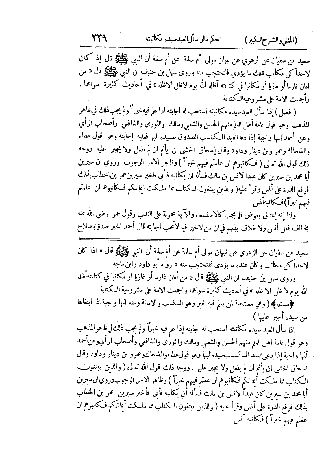 سعيد عن سفيان عن الزهري عن نبهان مولى أم سلمة عن أم سلمة أن النبي صلى الله عليه وسلم قال (إذا كان لإحداكن مكاتب وكان عنده ما يؤدي فلتحتجب منه) رواه أبو داود وابن ماجة وروى سهل بن حنيف أن النبي صلى الله عليه وسلم قال (من أعان غارماً أو غازياً أو مكاتباً في كتابته أظله الله يوم لا ظل إلا ظله) في أحاديث كثيرة سواهما وأجمعت الامة على مشروعية الكتابة (مسألة) (وهي مستحبة لمن يعلم فيه خير وهو الكسب والأمانة وعنه أنها واجبة إذا ابتغاها من سيده أجبر عليها) إذا سأل العبد سيده مكاتبته استحب له اجابته إذا علم فيه خيراً ولم يجب ذلك في ظاهر المذهب وهو قول عامة أهل العلم منهم الحسن والشعبي ومالك والثوري والشافعي وأصحاب الرأي وعن أحمد أنها واجبة إذا دعى العبد المكتسب سيده إليها وهو قول عطاء والضحاك وعمرو بن دينار وداود وقال اسحاق اخشى ان يأتم إن لم يفعل ولا يجبر عليها.