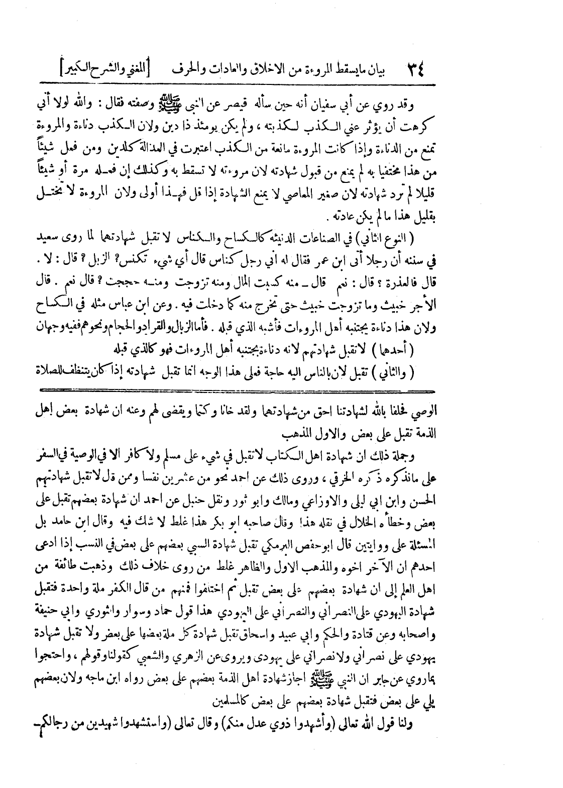 الذمة تقبل على بعض والأول المذهب وجملة ذلك أن شهادة أهل الكتاب لا تقبل في شئ على مسلم ولا كافر إلا في الوصية في السفر على ما نذكره ذكره الخرقي، وروي ذلك عن أحمد نحو من عشرين نفساً وممن قال لا تقبل شهادتهم الحسن وابن أبي ليلى والاوزاعي ومالك وأبو ثور ونقل حنبل عن أحمد أن شهادة بعضهم تقبل على بعض وخطأه الخلال في نقله هذا وقال صاحبه أبو بكر هذا غلط لا شك فيه وقال ابن حامد بل المسألة على ووايتين قال ابو حفص البرمكي تقبل شهادة السبي بعضهم على بعض في النسب إذا ادعى أحدهم أن الآخر أخوه والمذهب الأول والظاهر غلط من روى خلاف ذلك وذهبت طائفة من أهل العلم إلى أن شهادة بعضهم على بعض تقبل ثم اختلفوا فمنهم من قال الكفر ملة واحدة فتقبل شهادة اليهودي على النصراني والنصراني على اليهودي هذا قول حماد وسوار والثوري وأبي حنيفة وأصحابه وعن قتادة والحكم وأبي عبيد واسحاق تقبل شهادة كل ملة بعضها على بعض ولا تقبل شهادة يهودي على نصراني ولا نصراني على يهودي ويروى عن الزهري والشعبي كقولنا وقولهم، واحتجوا بما روي عن جابر أن النبي صلى الله عليه وسلم أجاز شهادة أهل الذمة بعضهم على بعض رواه ابن ماجه ولأن بعضهم يلي على بعض فتقبل شهادة بعضهم على بعض كالمسلمين ولنا قول الله تعالى (وأشهدوا ذوي عدل منكم) وقال تعالى (واستشهدوا شهيدين من رجالكم -