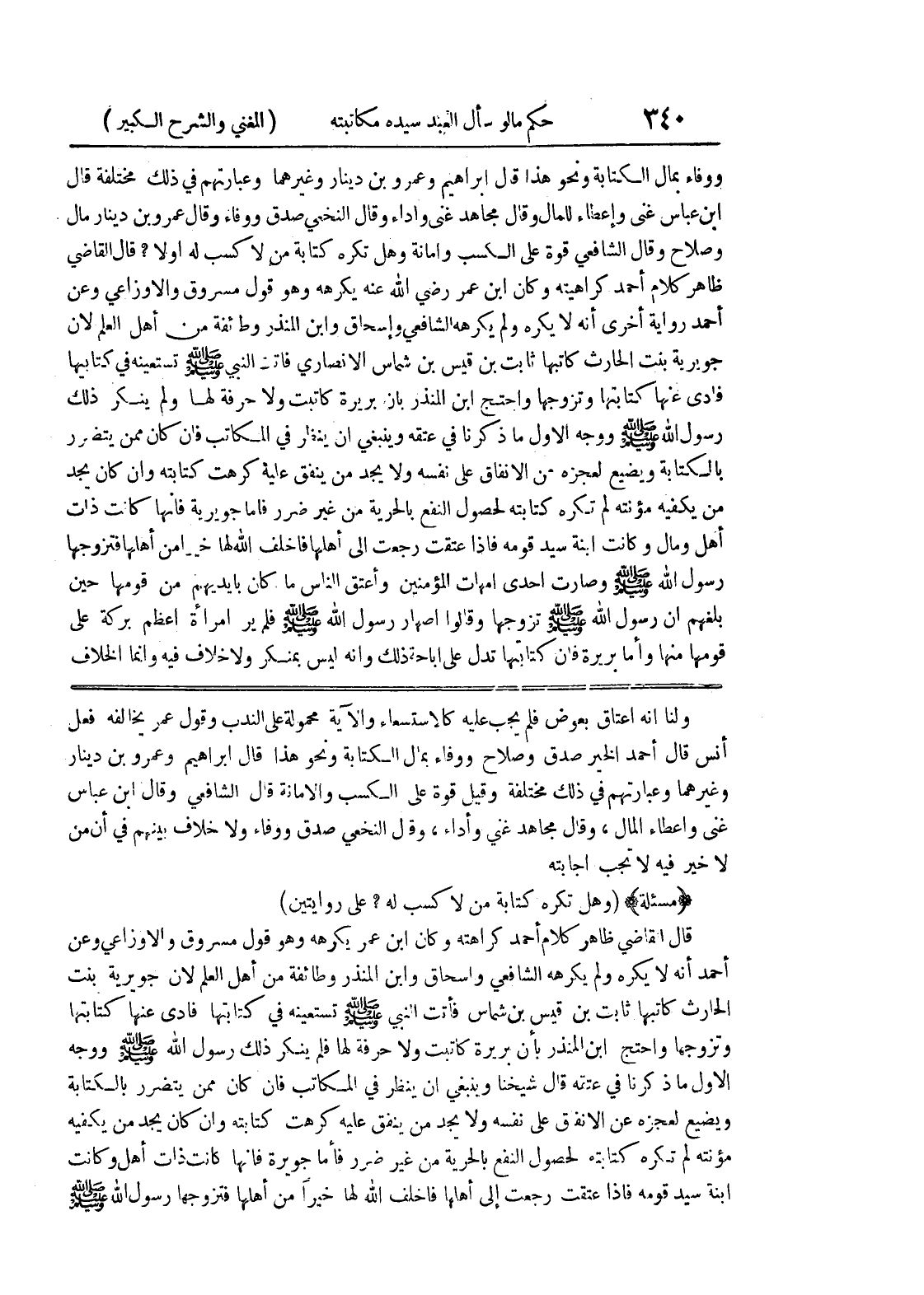 قال القاضي ظاهر كلام أحمد كراهته وكان ابن عمر يكرهه وهو قول مسروق والاوزاعي وعن أحمد أنه لا يكره ولم يكرهه الشافعي وإسحاق وابن المنذر وطائفة من أهل العلم لأن جويرية بنت الحارث كاتبها ثابت بن قيس بن شماس فأتت النبي صلى الله عليه وسلم تستعينه في كتابتها فأدى عنها كتابتها وتزوجها واحتج ابن المنذر بأن بريرة كاتبت ولا حرفة لها فلم ينكر ذلك رسول الله صلى الله عليه وسلم ووجه الأول ما ذكرنا في عتقه قال شيخنا وينبغي أن ينظر في المكاتب فإن كان ممن يتضرر بالكتابة ويضيع لعجزه عن الإنفاق على نفسه ولا يجد من ينفق عليه كرهت كتابته وإن كان يجد من يكفيه مؤنته لم تكره كتابته لحصول النفع بالحرية من غير ضرر فأما جويرة فإنها كانت ذات أهل وكانت ابنة سيد قومه فإذا عتقت رجعت إلى أهلها فأخلف الله لها خيراً من أهلها فتزوجها رسول الله صلى الله عليه وسلم