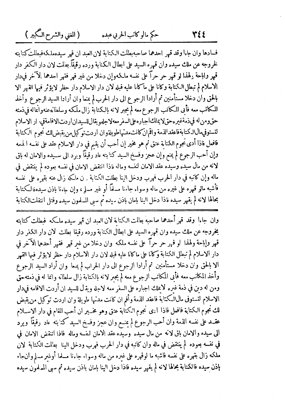 وإن جاءا وقد قهر أحدهما صاحبه بطلت الكتابة لأن العبد إن قهر سيده ملكه فبطلت كتابته بخروجه عن ملك سيده وإن قهره السيد على إبطال الكتابة ورده رقيقاً بطلت لأن دار الفكر دار قهر وإباحة ولهذا لو قهر حر حراً على نفسه ملكه وإن دخلا من غير قهر فقهر أحدهما الآخر في دار الإسلام لم تبطل الكتابة وكانا على ما كانا عليه قبله لأن دار الإسلام دار حظر لا يؤثر فيها القهر إلا بالحق وإن دخلا مستأمنين ثم أرادا الرجوع إلى دار الحرب لم يمنعا وأن أراد السيد الرجوع وأخذ المكاتب معه فأبى المكاتب الرجوع معه لم يجبر لأنه بالكتابة زال سلطانه وإنما له في ذمته حق ومن له دين في ذمة غيره لا يملك إجباره على السفر معه لأجله ويقال للسيد إن أردت الاقامة في دار الإسلام لتستوفي مال الكتابة فاعقد الذمة وأقم إن كانت مدتها طويلة وإن أردت توكيل من يقبض لك نجوم الكتابة فافعل فإذا أدى نجوم الكتابة عتق وهو مخير إن أحب المقام في دار الإسلام عقد على نفسه الذمة وإن أحب الرجوع لم يمنع وإن عجز وفسخ السيد كتابته عاد رقيقاً ويرد إلى سيده والأمان باق لأنه من مال سيده وسيده عقد الأمان لنفسه وماله فإذا اتنقض الامان في