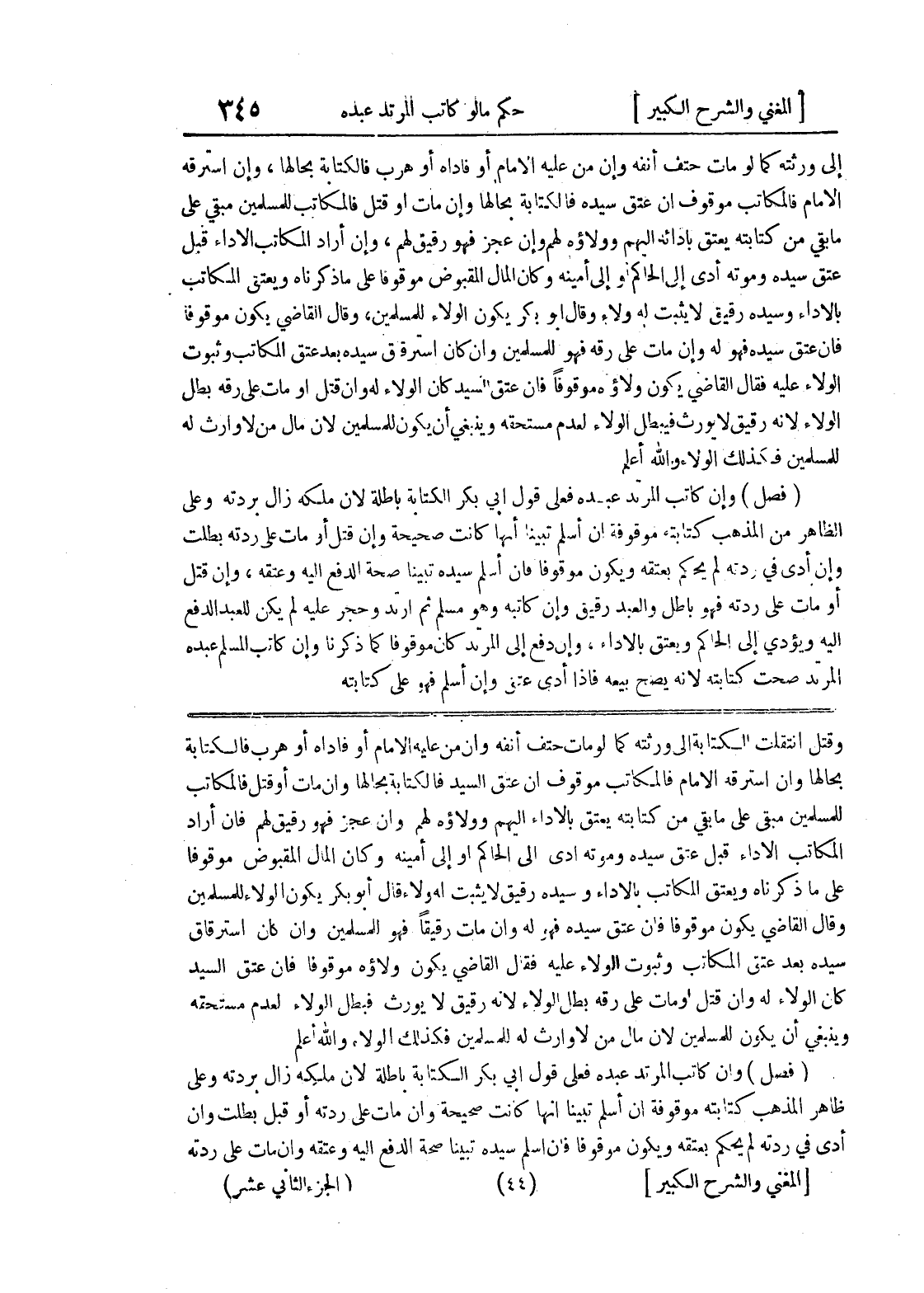 وقتل انتقلت الكتابة إلى ورثته كما لو مات حتف أنفه وإن من عليه الإمام أو فاداه أو هرب فالكتابة بحالها وإن استرقه الإمام فالمكاتب موقوف إن عتق السيد فالكتابة بحالها وإن مات أو قتل فالمكاتب للمسلمين مبقي على ما بقي من كتابته يعتق بالأداء إليهم وولاؤه لهم وإن عجز فهو رقيق لهم فإن أراد المكاتب الأداء قبل عتق سيده وموته أدى إلى الحاكم أو إلى أمينه وكان المال المقبوض موقوفاً على ما ذكرناه ويعتق المكاتب بالأداء وسيده رقيق لا يثبت له ولاء قال أبو بكر يكون الولاء للمسلمين وقال القاضي يكون موقوفاً فإن عتق سيده فهو له وإن مات رقيقاً فهو للمسلمين وإن كان استرقاق سيده بعد عتق المكاتب وثبوت الولاء عليه فقال القاضي يكون ولاؤه موقوفاً فإن عتق السيد كان الولاء له وإن قتل أو مات على رقه بطل الولاء لأنه رقيق لا يورث فبطل الولاء لعدم مستحقه وينبغي أن يكون للمسلمين لأن مال من لا وارث له للمسلمين فكذلك الولاء والله أعلم (فصل) وإن كاتب المرتد عبده فعلى قول أبي بكر الكتابة باطلة لأن ملكه زال بردته وعلى ظاهر المذهب كتابته موقوفة إن أسلم تبينا أنها كانت صحيحة وإن مات على ردته أو قبل بطلت وإن أدى في ردته لم يحكم بعتقه ويكون موقوفاً فإن أسلم سيده تبينا صحة الدفع إليه وعتقه وإن مات على ردته