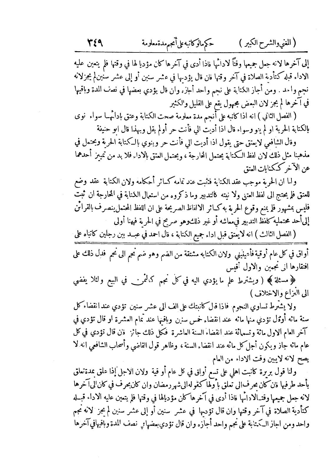 ولا يشترط تساوي النجوم فإذا قال كاتبتك على ألف إلى عشر سنين تؤدي عند انقضاء كل سنة مائة أو قال تؤدي منها مائة عند انقضاء خمس سنين وباقيها عند تمام العشرة أو قال تؤدي في آخر العام الاول مائة وتسعمائة عند انقضاء السنة العاشرة فكل ذلك جائز فإن قال تؤدي في كل عام مائة جاز ويكون أجل كل مائة عند انقضاء السنة، وظاهر قول القاضي وأصحاب الشافعي أنه لا يصح لأنه لا يبين وقت الأداء من العام ولنا قول بريرة كاتبت أهلي على تسع أواق في كل عام أوقيه ولأن الأجل إذا علق بمدة تعلق بأحد طرفيها فان كان بحرف إلى تعلق بأولها كقوله إلى شهر رمضان وإن كان بحرف في كان إلى آخرها لانه جعل جميعها وقت الادائها فإذا أدى في آخرها كان مؤدياً لها في وقتها فلم يتعين عليه الأداء قبله كتأدية الصلاة في آخر وقتها وإن قال تؤديها في عشر سنين أو إلى عشر سنين لم يجز لأنه نجم واحدا ومن أجاز الكتابة على نجم واحد أجازه وإن قال تؤدي بعضها في نصف المدة وباقيها في آخرها