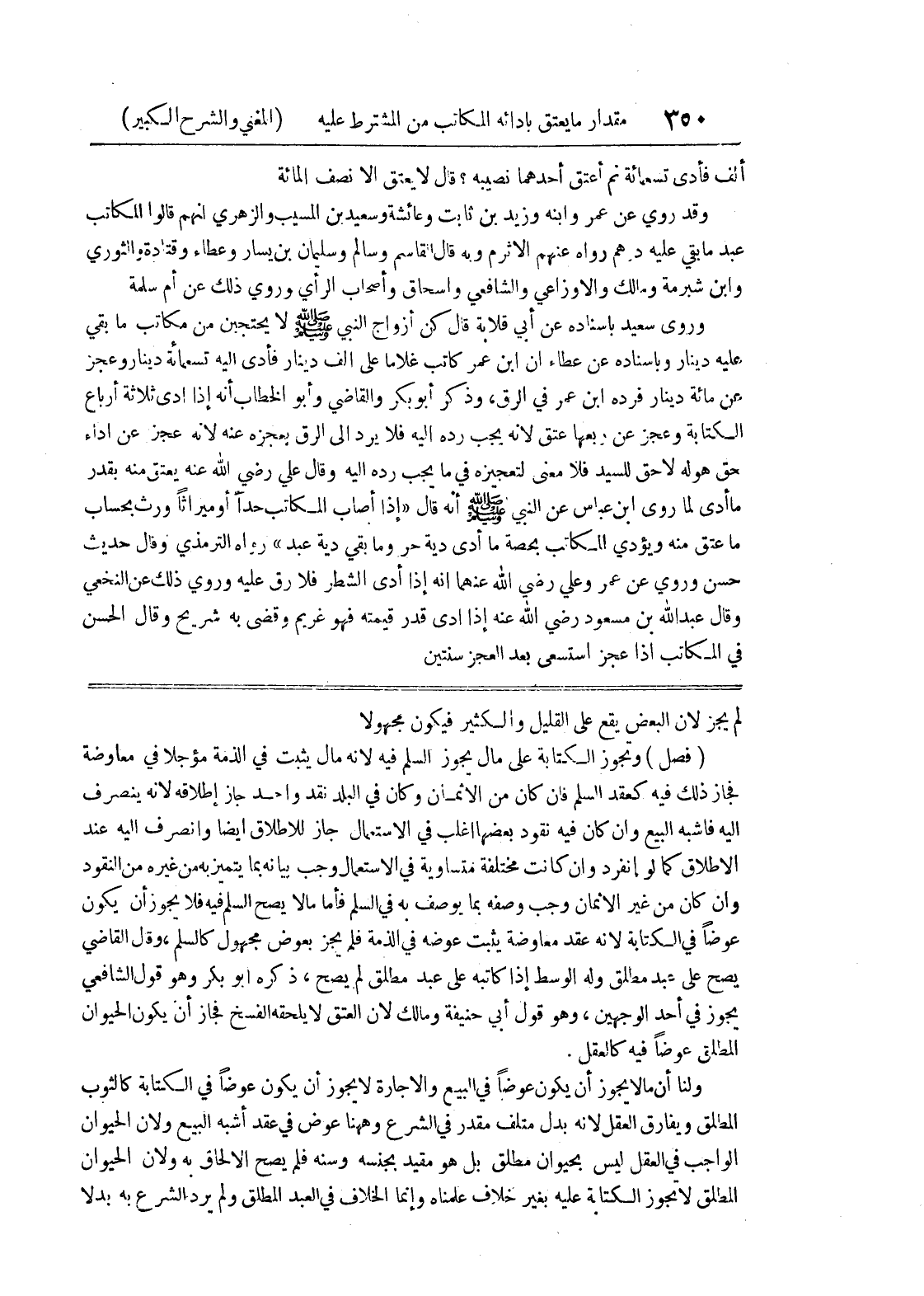لم يجز لأن البعض يقع على القليل والكثير فيكون مجهولاً (فصل) وتجوز الكتابة على مال يجوز السلم فيه لأنه مال يثبت في الذمة مؤجلاً في معاوضة فجاز ذلك فيه كعقد السلم فإن كان من الأثمان وكان في البلد نقد واحد جاز إطلاقه لأنه ينصرف إليه فاشبه البيع وإن كان فيه نقود بعضها أغلب في الاستعمال جاز للاطلاق أيضاً وانصرف إليه عند الإطلاق كما لو انفرد وإن كانت مختلفة متساوية في الإستعمال وجب بيانه بما يتميز به من غيره من النقود وإن كان من غير الاثمان وجب وصفه بما يوصف به في السلم فأما مالا يصح السلم فيه فلا يجوز أن يكون عوضاً في الكتابة لأنه عقد معاوضة يثبت عوضه في الذمة فلم يجز بعوض مجهول كالسلم، وقال القاضي يصح على عبد مطلق وله الوسط إذا كاتبه على عبد مطلق لم يصح، ذكره أبو بكر وهو قول الشافعي يجوز في أحد الوجهين، وهو قول أبي حنيفة ومالك لأن العتق لا يلحقه الفسخ فجاز أن يكون الحيوان المطلق عوضاً فيه كالعقل.