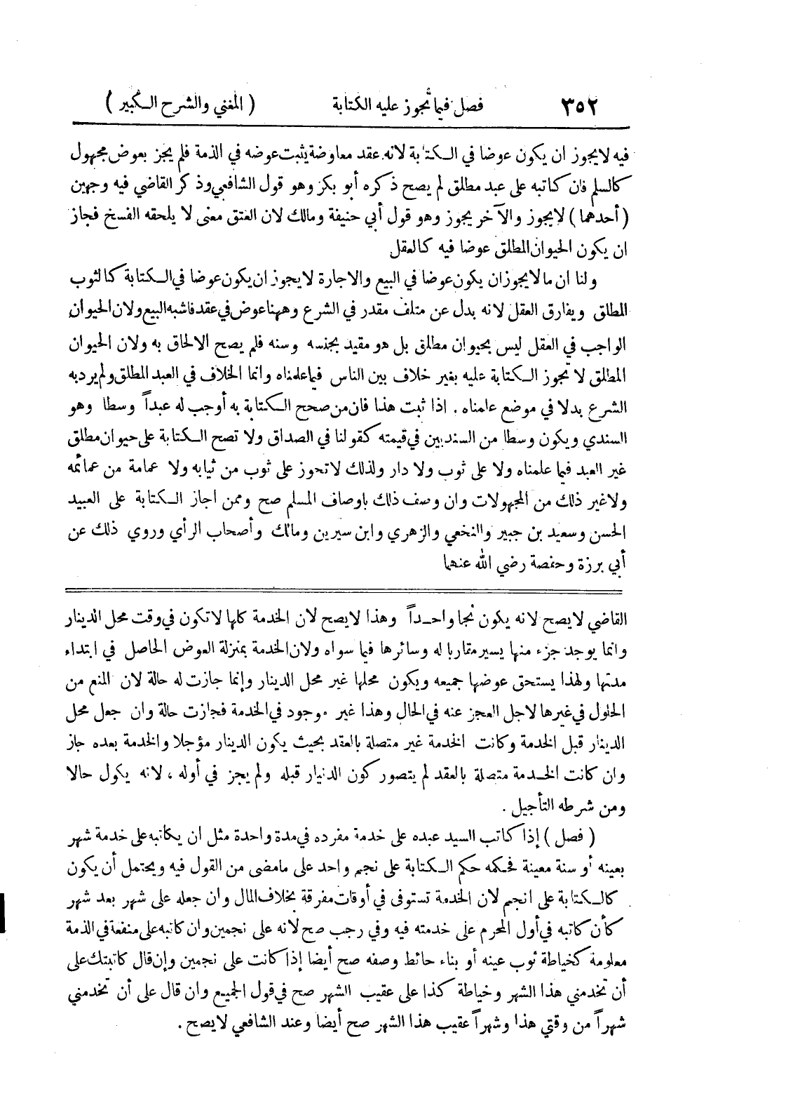 (فصل) إذا كاتب السيد عبده على خدمة مفردة في مدة واحدة مثل أن يكاتبه على خدمة شهر بعينه أو سنة معينة فحكمه حكم الكتابة على نجم واحد على ما مضى من القول فيه ويحتمل أن يكون كالكتابة على أنجم لأن الخدمة تستوفى في أوقات مفرقة بخلاف المال وإن جعله على شهر بعد شهر كأن كاتبه في أول المحرم على خدمته فيه وفي رجب صح لأنه على نجمين وإن كاتبه على منفعة في الذمة معلومة كخياطة ثوب عينه أو بناء حائط وصفه صح أيضاً إذا كانت على نجمين وإن قال كاتبتك على أن تخدمني هذا الشهر وخياطة كذا على عقيب الشهر صح في قول الجميع وإن قال على أن تخدمني شهراً من وقتي هذا وشهراً عقيب هذا الشهر صح أيضاً وعند الشافعي لا يصح.