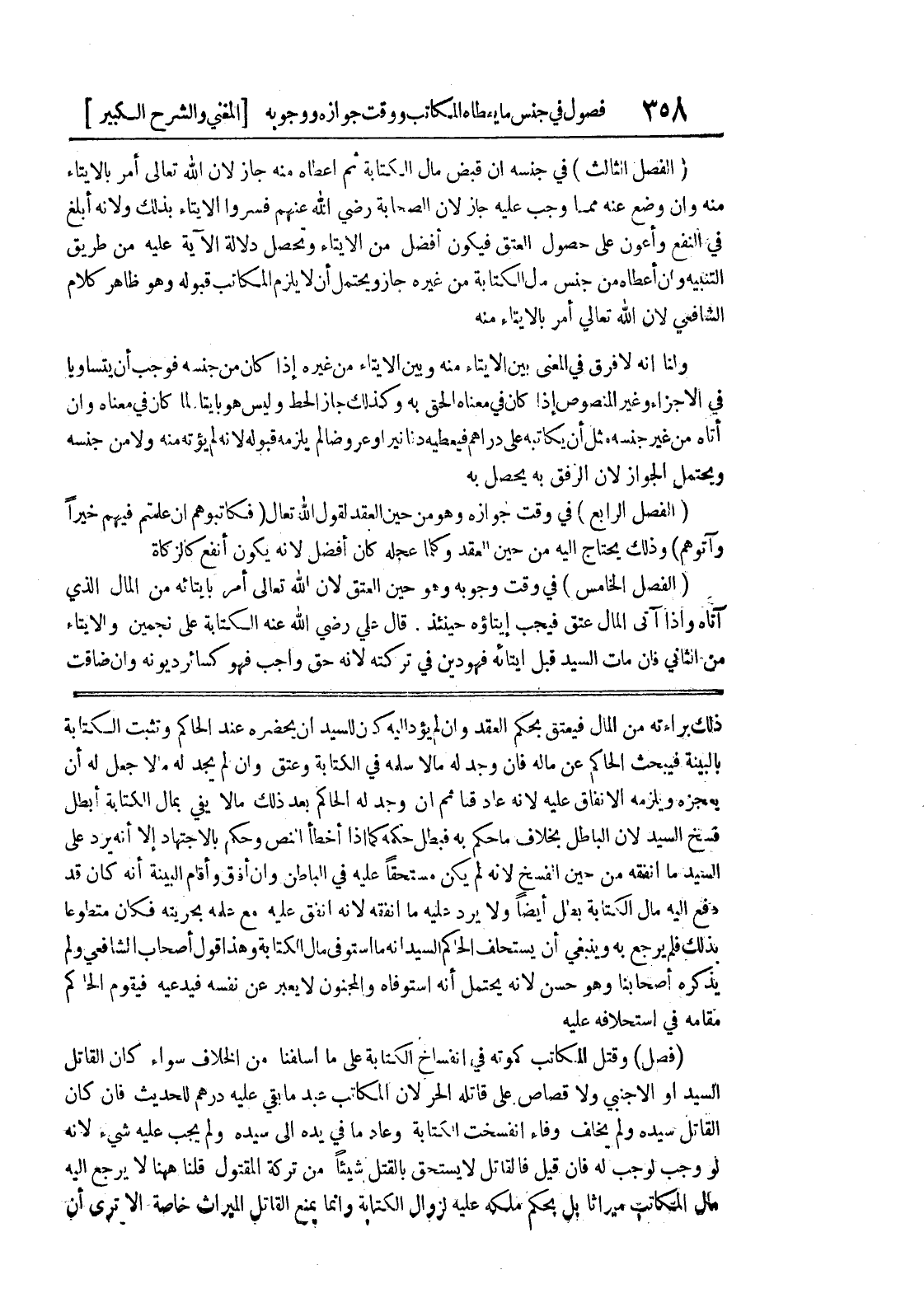 فسخ السيد لان الباطل بخلاف ما حكم به فبطل حكمه كما إذا أخطأ النص وحكم بالاجتهاد إلا أنه يرد على السيد ما أنفقه من حين الفسخ لأنه لم يكن مستحقاً عليه في الباطن وإن أفاق وأقام البينة أنه كان قد دفع إليه مال الكتابة بطل أيضاً ولا يرد عليه ما انفقه لأنه انفق عليه مع علمه بحريته فكان متطوعاً بذلك فلم يرجع به وينبغي أن يستحلف الحاكم السيد أنه ما استوفى مال الكتابة وهذا قول أصحاب الشافعي ولم يذكره أصحابنا وهو حسن لأنه يحتمل أنه استوفاه والمجنون لا يعبر عن نفسه فيدعيه فيقوم الحاكم مقامه في استحلافه عليه (فصل) وقتل المكاتب كموته في انفساخ الكتابة على ما أسلفنا من الخلاف سواء كان القاتل السيد أو الأجنبي ولا قصاص على قاتله الحر لأن المكاتب عبد ما بقي عليه درهم للحديث فإن كان القاتل سيده ولم يخلف وفاء انفسخت الكتابة وعاد ما في يده إلى سيده ولم يجب عليه شئ لأنه لو وجب لوجب له فإن قيل فالقاتل لا يستحق بالقتل شيئاً من تركة المقتول قلنا ههنا لا يرجع إليه مال المكاتب ميراثاً بل بحكم ملكه عليه لزوال الكتابة وإنما يمنع القاتل الميراث خاصة الا ترى أن