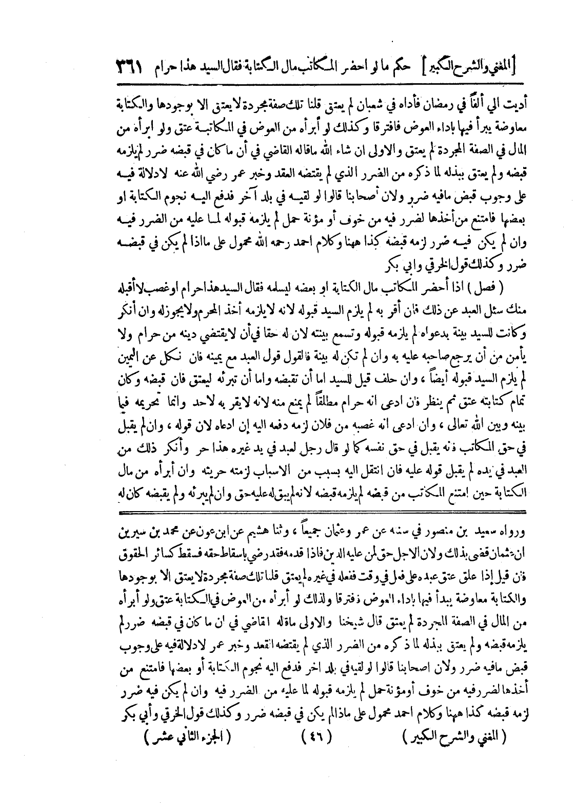 فإن قيل إذا علق عتق عبده على فعل في وقت ففعله في غيره لم يعتق قلنا تلك صفة مجردة لا يعتق إلا بوجودها والكتابة معاوضة يبداً فيها بأداء العوض فافترقا ولذلك لو أبرأه من العوض في الكتابة عتق ولو أبرأه من المال في الصفة المجردة لم يعتق قال شيخنا والأولى ما قاله القاضي في أن ما كان في قبضه ضرر لم يلزمه قبضه ولم يعتق ببذله لما ذكره من الضرر الذي لم يقتضه القعد وخبر عمر لا دلالة فيه على وجوب قبض ما فيه ضرر ولأن أصحابنا قالوا لو لقيه في بلد آخر فدفع إليه نجوم الكتابة أو بعضها فامتنع من أخذها لضرر فيه من خوف أو مؤنة حمل لم يلزمه قبوله لما عليه من الضرر فيه وإن لم يكن فيه ضرر لزمه قبضه كذا ههنا وكلام أحمد محمول على ماذا لم يكن في قبضه ضرر وكذلك قول الخرقي وأبي بكر