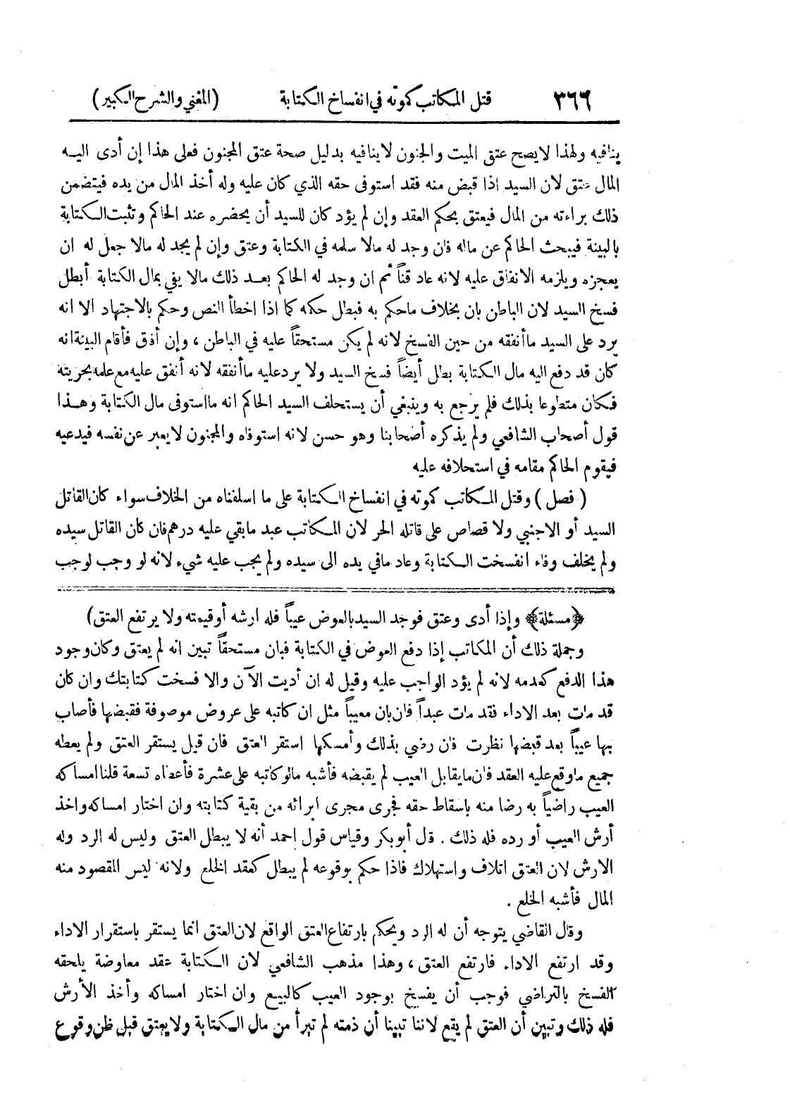 (مسألة) وإذا أدى وعتق فوجد السيد بالعوض عيباً فله أرشه أو قيمته ولا يرتفع العتق) وجملة ذلك أن المكاتب إذا دفع العوض في الكتابة فبان مستحقاً تبين أنه لم يعتق وكان وجود هذا الدفع كعدمه لأنه لم يؤد الواجب عليه وقيل له إن أديت الآن وإلا فسخت كتابتك وإن كان قد مات بعد الأداء فقد مات عبداً فإن بان معيباً مثل أن كاتبه على عروض موصوفة فقبضها فأصاب بها عيباً بعد قبضها نظرت فإن رضي بذلك وأمسكها استقر العتق فإن قيل يستقر العتق ولم يعطه جميع ما وقع عليه العقد فإن ما يقابل العيب لم يقبضه فأشبه ما لو كاتبه على عشرة فأعطاه تسعة قلنا إمساكه العيب راضياً به رضا منه باسقاط حقه فجرى مجرى ابرائه من بقية كتابته وإن اختار إمساكه وأخذ أرش العيب أو رده فله ذلك.