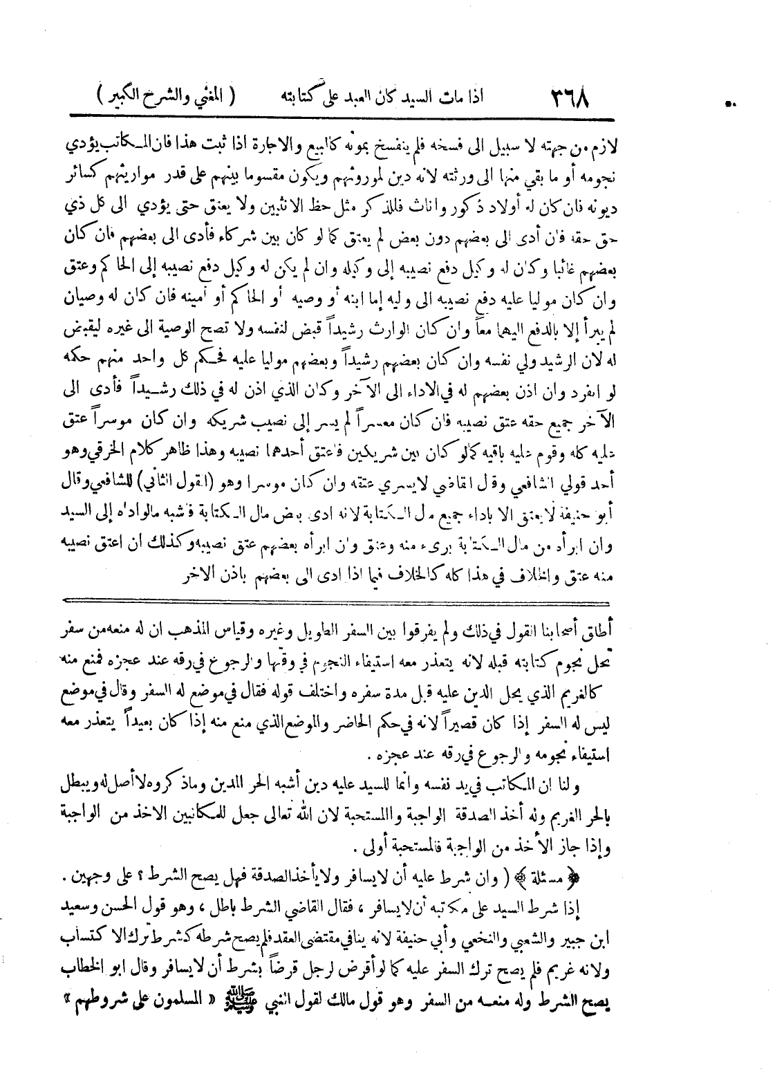 إذا شرط السيد على مكاتبه أن لا يسافر، فقال القاضي الشرط باطل، وهو قول الحسن وسعيد ابن جبير والشعبي والنخعي وأبي حنيفة لأنه ينافي مقتضى العقد فلم يصح شرطه كشرط ترك الاكتساب ولأنه غريم فلم يصح ترك السفر عليه كما لو أقرض لرجل قرضاً بشرط أن لا يسافر وقال أبو الخطاب يصح الشرط وله منعه من السفر وهو قول مالك لقول النبي صلى الله عليه وسلم (المسلمون على شروطهم)