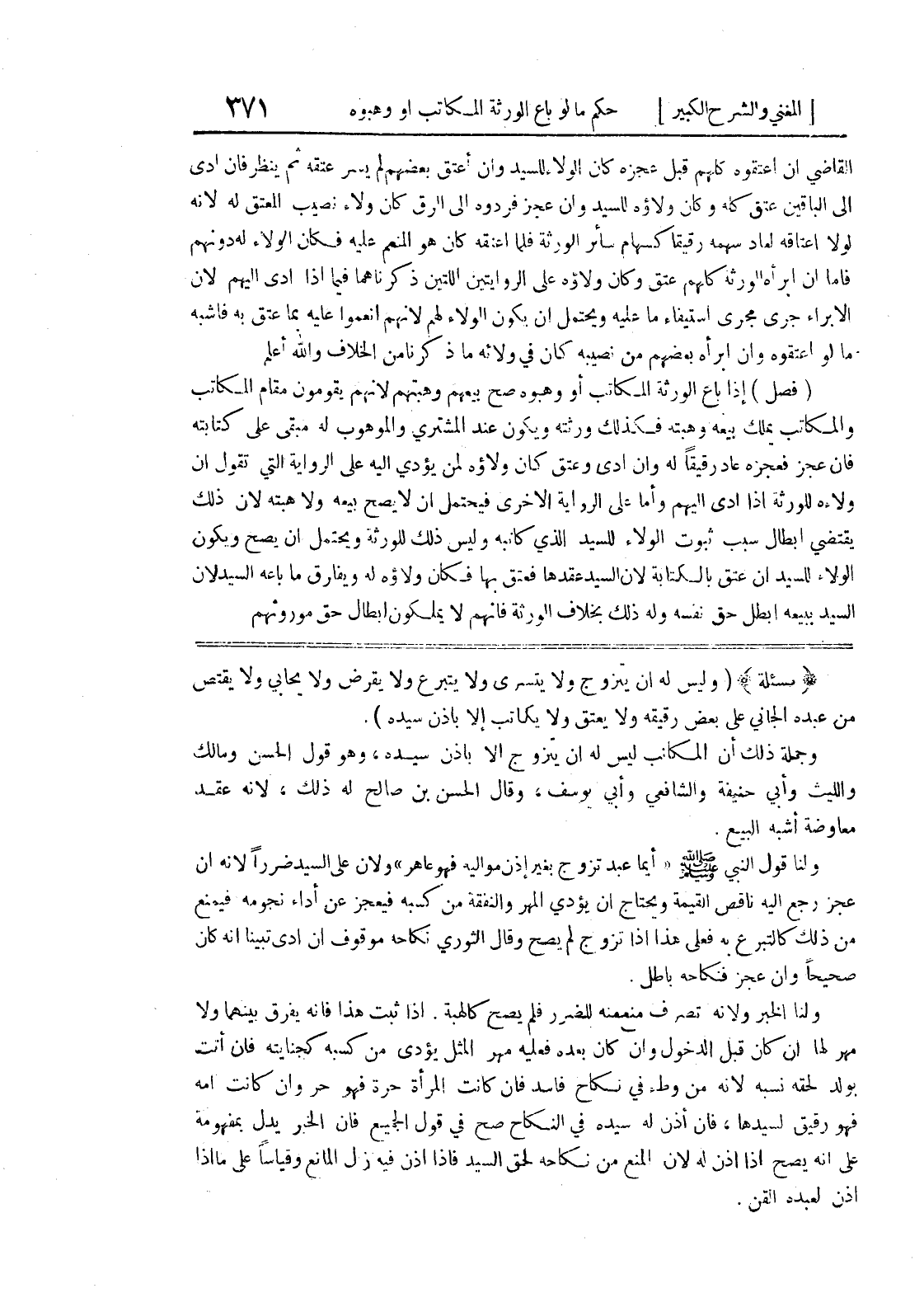 وجملة ذلك أن المكاتب ليس له أن يتزوج إلا بإذن سيده، وهو قول الحسن ومالك والليث وابي حنيفة والشافعي وأبي يوسف، وقال الحسن بن صالح له ذلك، لأنه عقد معاوضة أشبه البيع.