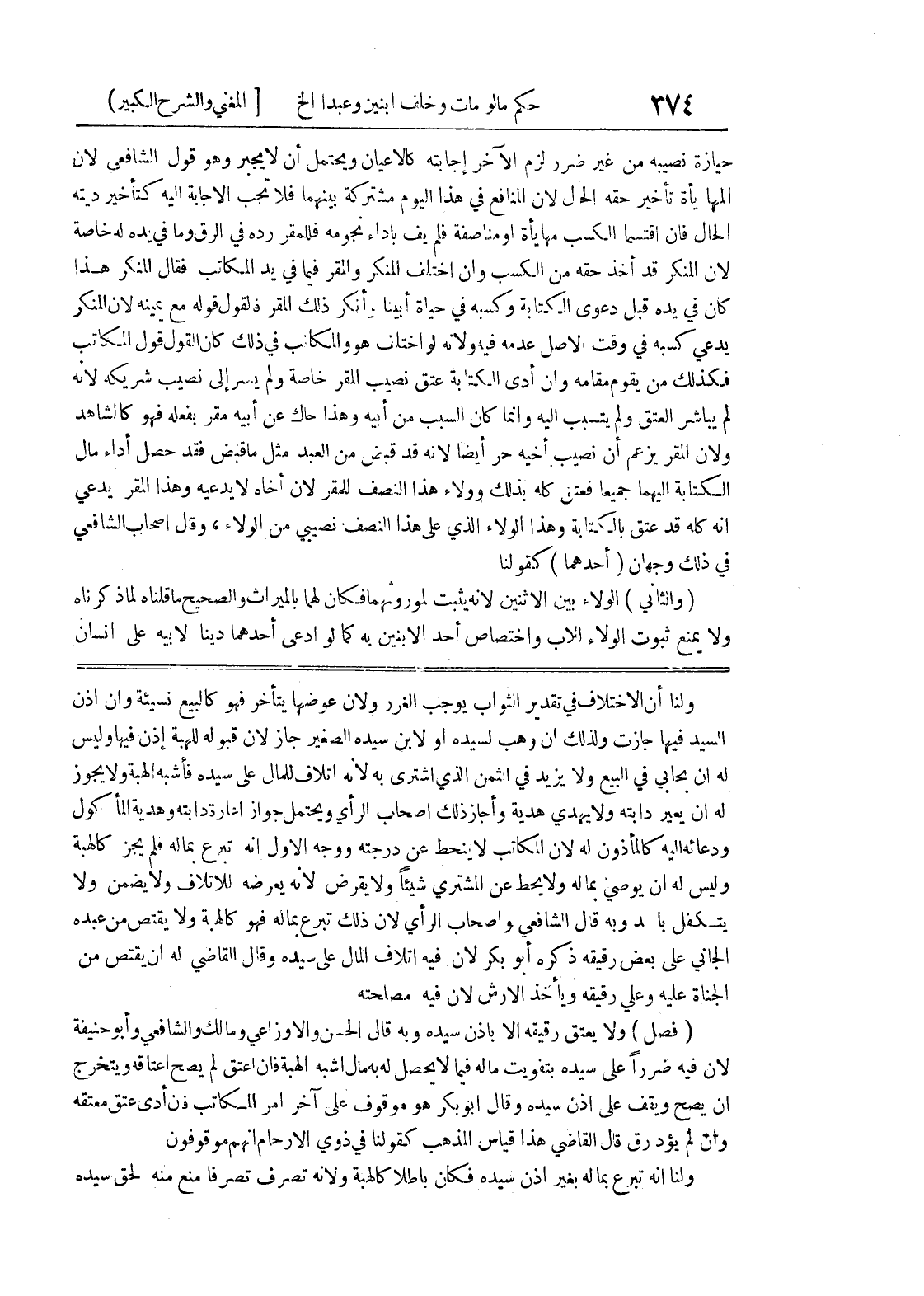 ولنا أن الاختلاف في تقدير الثواب يوجب الغرر ولأن عوضها يتأخر فهو كالبيع نسيئة وإن أذن السيد فيها جازت ولذلك إن وهب لسيده أو لابن سيده الصغير جاز لأن قبوله للهبة إذن فيها وليس له أن بحابي في البيع ولا يزيد في الثمن الذي اشترى به لأنه اتلاف للمال على سيده فأشبه الهبة ولا يجوز له أن يعير دابته ولا يهدي هدية وأجاز ذلك أصحاب الرأي ويحتمل جواز اعارة دابته وهدية المأكول ودعائه إليه كالمأذون له لأن المكاتب لا ينحط عن درجته ووجه الأول أنه تبرع بماله فلم يجز كالهبة وليس له أن يوصي بماله ولا يحط عن المشتري شيئاً ولا يقرض لأنه يعرضه للاتلاف ولا يضمن ولا يتكفل با؟؟ وبه قال الشافعي وأصحاب الرأي لأن ذلك تبرع بماله فهو كالهبة ولا يقتص من عبده الجاني على بعض رقيقه ذكره أبو بكر لأن فيه اتلاف المال على سيده وقال القاضي له أن يقتص من الجناة عليه وعلى رقيقه ويأخذ الأرش لأن فيه مصلحته (فصل) ولا يعتق رقيقه إلا بإذن سيده وبه قال الحسن والاوزاعي ومالك والشافعي وأبو حنيفة لأن فيه ضرراً على سيده بتفويت ماله فيما لا يحصل له به مال أشبه الهبة فإن أعتق لم يصح إعتاقه ويتخرج أن يصح ويقف على إذن سيده وقال أبو بكر هو موقوف على آخر أمر المكاتب فإن أدى عتق معتقه وإن لم يؤد رق قال القاضي هذا قياس المذهب كقولنا في ذوي الأرحام إنهم موقوفون