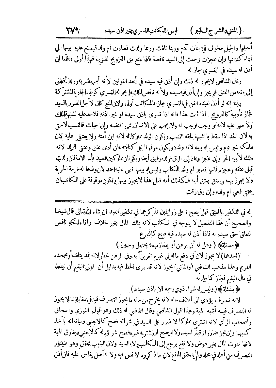 له في تكفير بالعتق فهل يصح؟ على روايتين نذكرهما في تكفير العبد إن شاء الله تعالى قال شيخنا والصحيح أن هذا التفصيل لا يتوجه في المكاتب لأنه يملك المال بغير خلاف وإنما ملكه ناقص لتعلق حق سيده به فإذا أذن له سيده فيه صح كالتبرع (مسألة) (وهل له أن برهن أو يضارب؟ يحتمل وجهين) (أحدهما) لا يجوز لأن في دفع ماله إلى غيره تغريراً به وفي الرهن خطر لأنه قد يتلف أو يجحده الغريم وهذا مذهب الشافعي (والثاني) يجوز لأنه قد يرى الحظ فيه بدليل أن لولي اليتيم أن يفعله