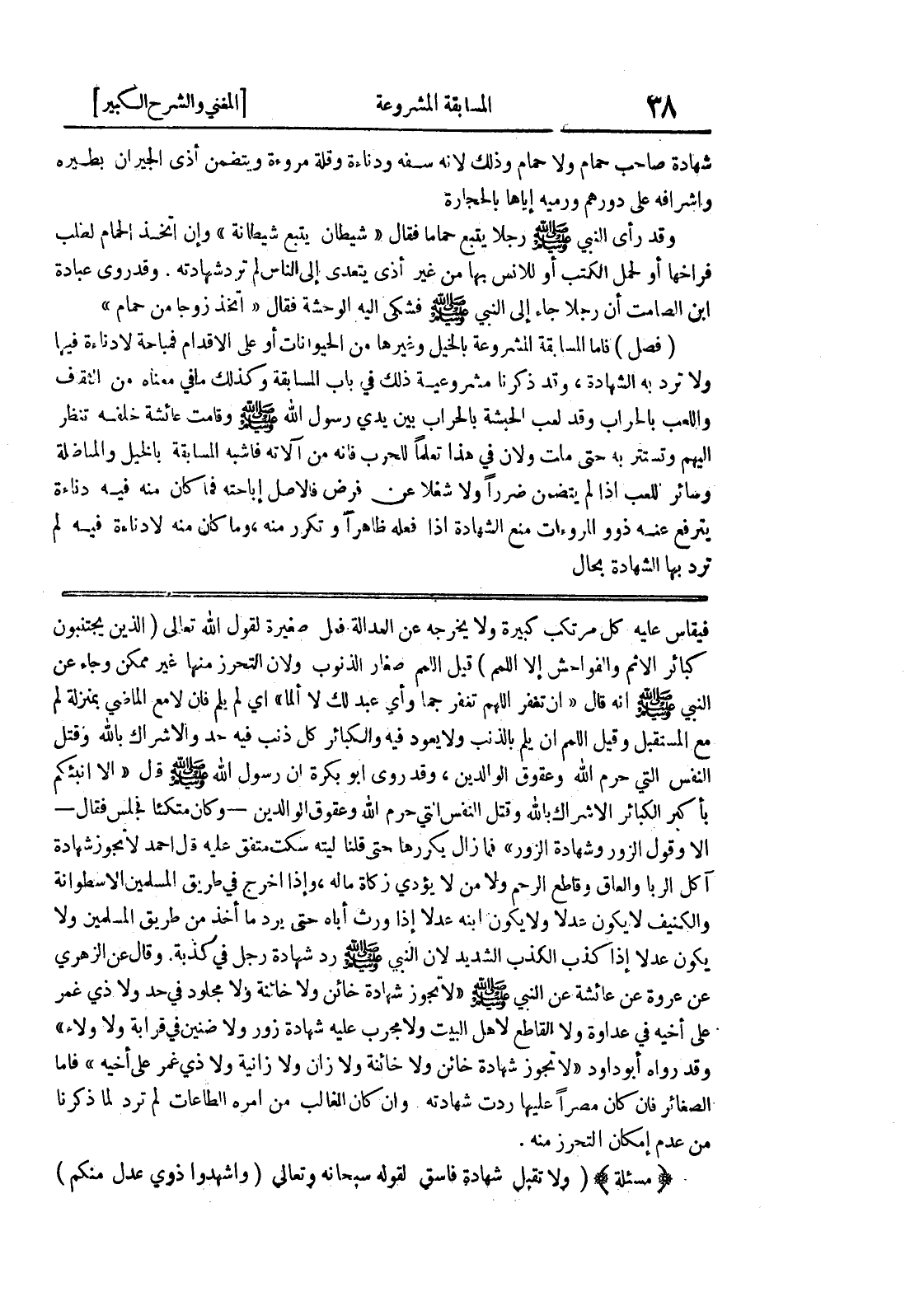 فيقاس عليه كل مرتكب كبيرة ولا يخرجه عن العدالة فعل صغيرة لقول الله تعالى (الذين يجتنبون كبائر الاثم والفواحش إلا اللمم) قيل اللمم صغار الذنوب ولان التحرز منها غير ممكن وجاء عن النبي صلى الله عليه وسلم أنه قال (إن تغفر اللهم تغفر جما واي عبد لك لا ألما) اي لم يلم فان لامع الماضي بمنزلة لم مع المستقبل وقيل اللمم ان يلم بالذنب ولا يعود فيه والكبائر كل ذنب فيه حد والاشراك بالله وقتل النفس التي حرم الله وعقوق الوالدين، وقد روى أبو بكرة أن رسول الله صلى الله عليه وسلم قال (ألا أنبئكم بأكبر الكبائر الإشراك بالله وقتل النفس التي حرم الله وعقوق الوالدين - وكان متكئاً فجلس فقال - ألا وقول الزور وشهادة الزور) فما زال يكررها حتى قلنا ليته سكت متفق عليه قال أحمد لا تجوز شهادة