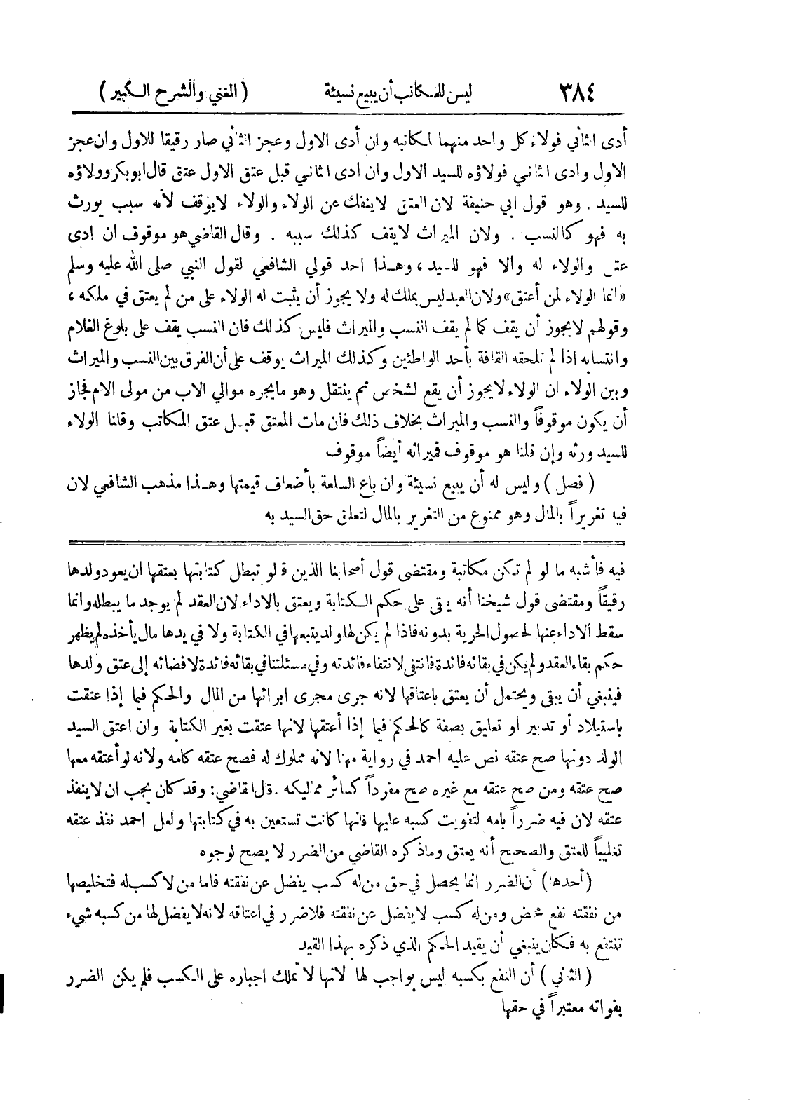 قال القاضي: وقد كان يجب أن لا ينفذ عتقه لأن فيه ضرراً بأمه لتفويت كسبه عليها فإنها كانت تسعين به في كتابتها ولعل أحمد نفذ عتقه تغليباً للعتق والحصيح أنه يعتق وما ذكره القاضي من الضرر لا يصح لوجوه (أحدها) أن الضرر إنما يحصل في حق من له كسب يفضل عن نفقته فأما من لا كسب له فتخليصها من نفقته نفع محض ومن له كسب لا يفضل عن نفقته فلا ضرر في اعتاقه لأنه لا يفضل لها من كسبه شئ تنتفع به فكان ينبغي أن يقيد الحكم الذي ذكره بهذا القيد (الثاني) أن النفع بكسبه ليس بواجب لها لأنها لا تملك إجباره على الكسب فلم يكن الضرر بفواته معتبراً في حقها
