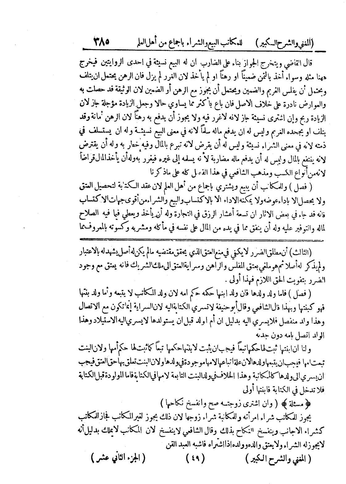 وهذا ولد منفصل فلا يسري إليه بدليل أن أم الولد قبل أن يستولدها لا يسري إليه الاستيلاد وهذا الولد اتصل بأمه دون جدته ولنا أن ابنتها ثبت لها حكمها تبعاً فيجب أن يثبت لابنتها حكمها تبعاً كما ثبت لها حكم أمها ولأن البنت تبعت أمها فيجب أن يتبعها ولدها لأن علة اتباعها لأمها موجودة في ولدها ولأن البنت تعلق بها حق العتق فيجب أن يسري إلى ولدها كالمكاتبة وهذا الخلاف في ولد البنت التابعة لأمها في الكتابة فأما المولودة قبل الكتابة فلا تدخل في الكتابة فابنتها أولى (مسألة) (وإن أشترى زوجته صح وانفسخ نكاحها) يجوز للمكاتب شراء امرأته وللمكاتبة شراء زوجها لأن ذلك يجوز لغير المكاتب فجاز للمكاتب كشراء الأجانب وينفسخ النكاح بذلك وقال الشافعي لا ينفسخ لأن المكاتب لا يملك بدليل أنه لا يجوز له الشراء ولا يعتق والده وولده إذا اشتراه فأشبه العبد القن