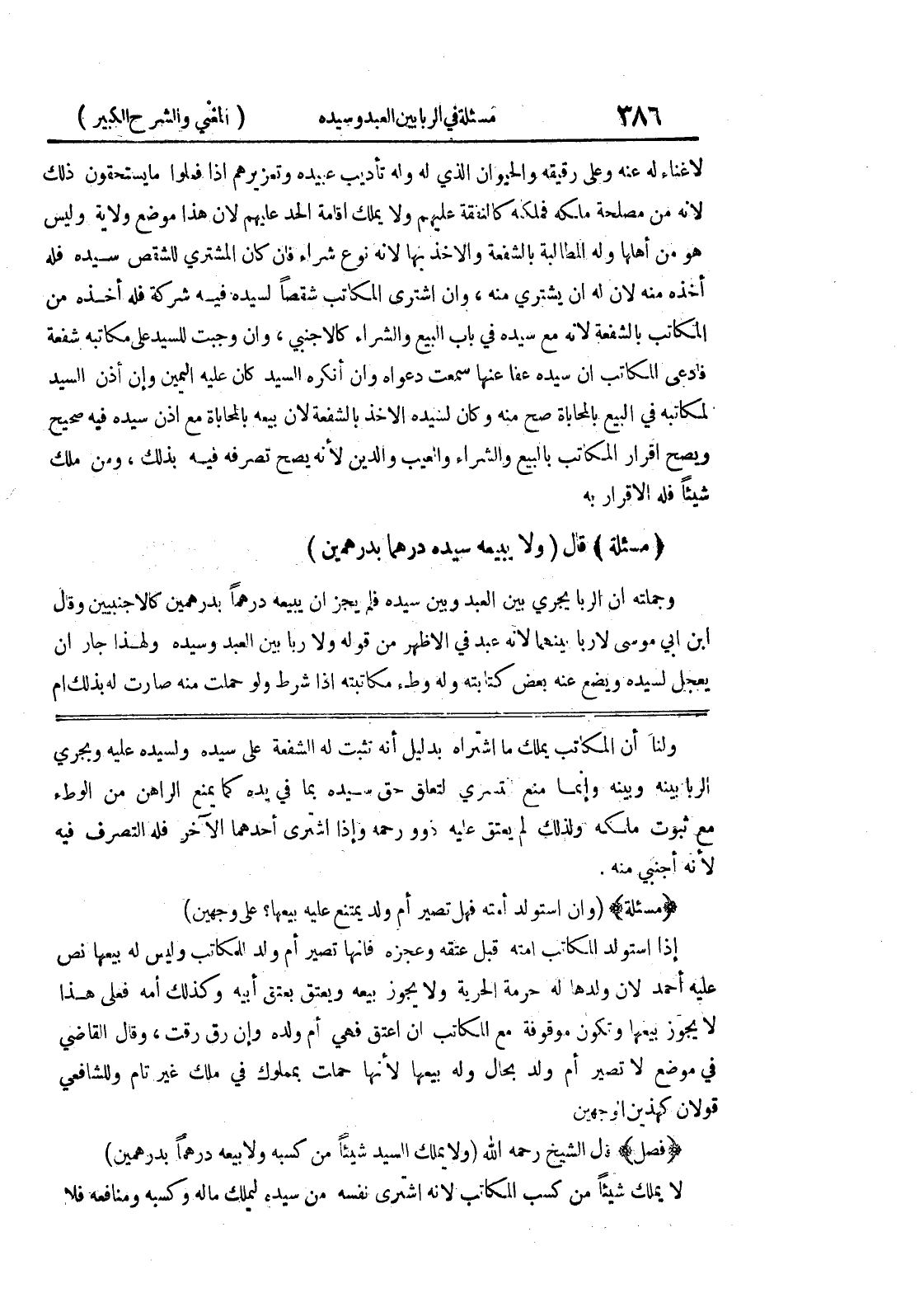 (مسألة) (وإن استولد أمته فهل تصير أم ولد يمتنع عليه بيعها؟ على وجهين) إذا استولد المكاتب أمته قبل عتقه وعجزه فإنها تصير أم ولد للمكاتب وليس له بيعها نص عليه أحمد لأن ولدها له حرمة الحرية ولا يجوز بيعه ويعتق بعتق أبيه وكذلك أمه فعلى هذا لا يجوز بيعها وتكون موقوفة مع المكاتب إن أعتق فهي أم ولده وإن رق رقت، وقال القاضي في موضع لا تصير أم ولد بحال وله بيعها لأنها حملت بمملوك في ملك غير تام وللشافعي قولان كهذين الوجهين (فصل) قال الشيخ رحمه الله (ولا يملك السيد شيئاً من كسبه ولا بيعه درهماً بدرهمين)