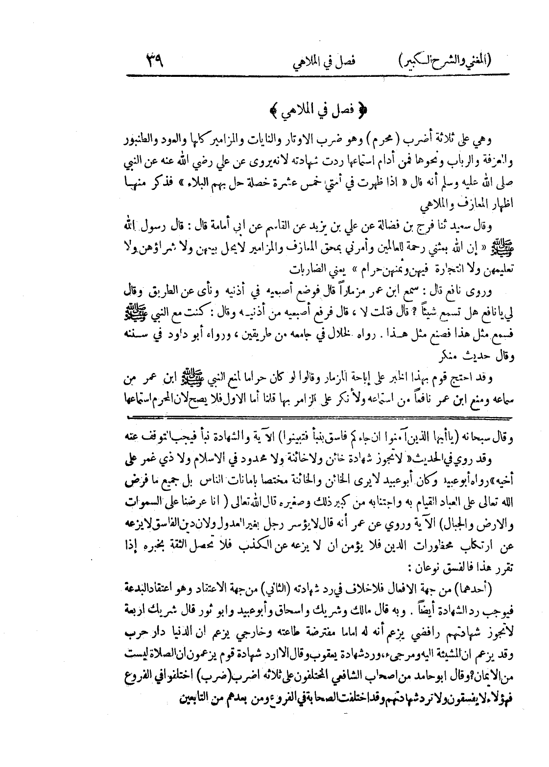 وقال سبحانه (يا أيها الذين آمنوا إن جاءكم فاسق بنبإ فتبينوا) الآية والشهادة نبأ فيجب التوقف عنه وقد روي في الحديث (لا تجوز شهادة خائن ولا خائنة ولا محدود في الإسلام ولا ذي غمر على أخيه) رواه أبو عبيد وكان أبو عبيد لا يرى الخائن والخائنة مختصا بامانات الناس بل جميع ما فرض الله تعالى على العباد القيام به واجتنابه من كبير ذلك وصغيره قال الله تعالى (انا عرضنا على السموات والارض والجبال) الآية وروي عن عمر أنه قال لا يؤسر رجل بغير العدول ولان دين الفاسق لا يزعه عن ارتكاب محظورات الدين فلا يؤمن أن لا يزعه عن الكذب فلا تحصل الثقة بخبره إذا تقرر هذا فالفسق نوعان: (احدهما) من جهة الأفعال فلا خلاف في رد شهادته (الثاني) من جهة الاعتقاد وهو اعتقاد البدعة فيوجب رد الشهادة أيضاً.