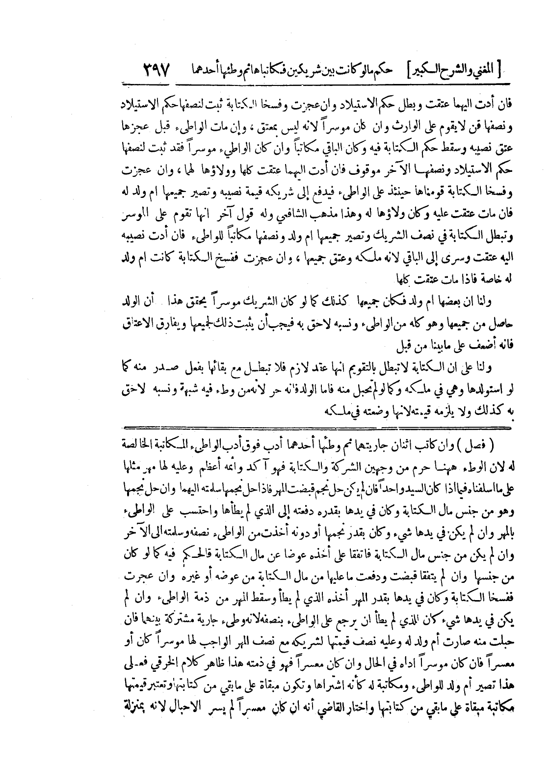 له لان الوطئ ههنا حرم من وجهين الشركة والكتابة فهو آكد وإثمه أعظم وعليه لها مهر مثلها على ما أسلفناه فيما إذا كان السيد واحداً فان لم يكن حل نجم قبضت المهر فإذا حل نجمها سلمته إليهما وإن حل نجمها وهو من جنس مال الكتابة وكان في يدها بقدره دفعته إلى الذي لم يطأها واحتسب على الواطئ بالمهر وإن لم يكن في يدها شئ وكان بقدر نجمها أو دونه أخذت من الواطئ نصفه وسلمته إلى الآخر وإن لم يكن من جنس مال الكتابة فاتفقا على أخذه عوضاً عن مال الكتابة فالحكم فيه كما لو كان من جنسها وإن لم يتفقا قبضت ودفعت ما عليها من مال الكتابة من عوضه أو غيره وإن عجرت ففسخا الكتابة وكان في يدها بقدر المهر أخذه الذي لم يطأ وسقط المهر من ذمة الواطئ وإن لم يكن في يدها شئ كان للذي لم يطأ أن يرجع على الواطئ بنصفه لأنه وطئ جارية مشتركة بينهما فإن حبلت منه صارت أم ولد له وعليه نصف قيمتها لشريكه مع نصف المهر الواجب لها موسراً كان أو معسراً فإن كان موسراً أداه في الحال وإن كان معسراً فهو في ذمته هذا ظاهر كلام الخرقي فعلى هذا تصير أم ولد للواطئ ومكاتبة له كأنه اشتراها وتكون مبقاة على ما بقي من كتابتها وتعتبر قيمتها مكاتبة مبقاة على ما بقي من كتابتها واختار القاضي أنه إن كان معسراً لم يسر الإحبال لأنه بمنزلة
