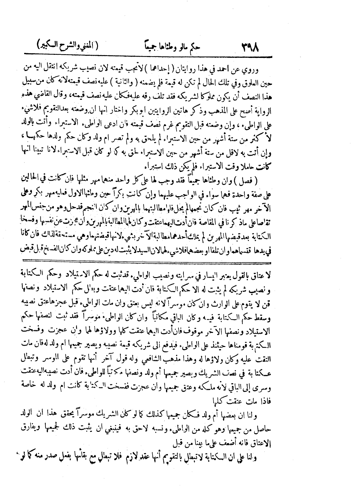 لا عتاق بالقول يعتبر اليسار في سرايته ونصيب الواطئ قد ثبت له حكم الاستيلاد وحكم الكتابة ونصيب شريكه لم يثبت له إلا حكم الكتابة فإن أدت إليهما عتقت وبطل حكم الاستيلاد ونصفها قن لا يقوم على الوارث وإن كان موسراً لأنه ليس بعتق وان مات الواطئ قبل عجزها عتق نصيبه وسقط حكم الكتابة فيه وكان الباقي مكاتباً وإن كان الواطئ موسراً فقد ثبت لنصفها حكم الاستيلاد ونصفها الآخر موقوف فإن أدت إليهما عتقت كلها وولاؤها لهما وإن عجزت وفسخت الكتابة قومناها حيئنذ على الواطئ فيدفع إلى شريكه قيمة نصيبه ويصير جميعها أم ولد له فإن مات التقت عليه وكان ولاؤها له وهذا مذهب الشافعي وله قول آخر أنها تقوم على الموسر وتبطل عكتابة في نصف الشريك ويصير جميعها أم ولد ونصفها مكاتباً للواطئ فإن أدت نصيبه إليه عتقت وسرى إلى الباقي لأنه ملكه وعتق جميعها وإن عجزت ففسخت الكتابة كانت أم ولد له خاصة
