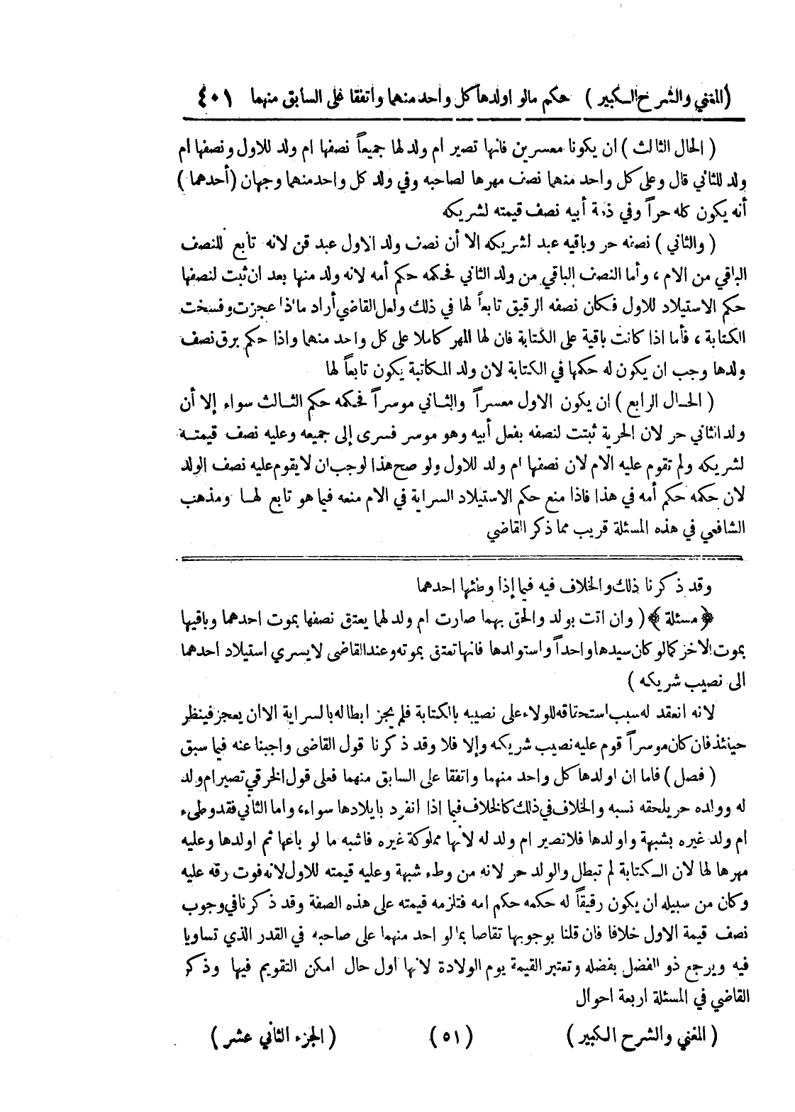 وقد ذكرنا ذلك والخلاف فيه فيما إذا وطئها أحدهما (مسألة) (وان أتت بولد وألحق بهما صارت أم ولد لهما يعتق نصفها بموت أحدهما وباقيها بموت الآخر كما لو كان سيدها واحداً واستولدها فإنها تعتق بموته وعند القاضي لا يسري استيلاد أحدهما إلى نصيب شريكه) لأنه انعقد له سبب استحقاقه للولاء على نصيبه بالكتابة فلم يجز ابطاله بالسراية إلا أن يعجز فينظر حينئذ فإن كان موسراً قوم عليه نصيب شريكه وإلا فلا وقد ذكرنا قول القاضى واجبنا عنه فيما سبق (فصل) فأما إن أولدها كل واحد منهما واتفقا على السابق منهما فعلى قول الخرقي تصير أم ولد له وولده حر يلحقه نسبه والخلاف في ذلك كالخلاف فيما إذا انفرد بإيلادها سواء، وأما الثاني فقد وطئ
