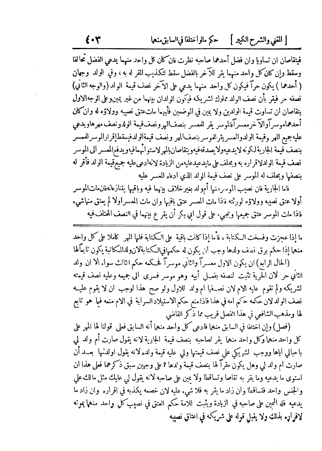 ما إذا عجزت وفسخت الكتابة، فأما إذا كانت باقية على الكتابة فلها المهر كاملاً على كل واحد منهما إذا حكم برق نصف ولدها وجب أن يكون له حكمها في الكتابة لأن ولد المكاتبة يكون تابعاً لها (الحال الرابع) أن يكون الأول معسراً والثاني موسراً فحكمه حكم الثالث سواء إلا أن ولد الثاني حر لأن الحرية تثبت لنصفه بفعل أبيه وهو موسر فسرى إلى جميعه وعلى نصف قيمته لشريكه ولم تقوم عليه الأم لأن نصفها أم ولد للأول ولو صح هذا لوجب أن لا يقوم عليه نصف الولد لأن حكمه حكم أمه في هذا فإذا منع حكم الاستيلاد السراية في الأم منعه فيما هو تابع لها ومذهب الشافعي في هذا الفصل قريب مما ذكر القاضي (فصل) وإن اختلفا في السابق منهما فادعى كل واحد منهما أنه السابق فعلى قولنا لها المهر على كل واحد منهما وكل واحد منهما يقر لصاحبه بنصف قيمة الجارية لأنه يقول صارت أم ولد لي بإحبالي إياها ووجب لشريكي علي نصف قيمتها ولي عليه قيمة ولده لأنه يقول أولدتها بعد أن صارت أم ولد لي وهل يكون مقراً لها بنصف قيمة ولدها؟ على وجهين سبق ذكرهما فعلى هذا إن استوى ما يدعيه وما يقر به تقاصا وتساقطا ولا يمين على صاحبه لأنه يقول لي عليك مثل مالك على والجنس واحد فتساقطا وإن زاد ما يقر به فلا شئ عليه لأن خصمه يكذبه في إقراره وإن زاد ما يدعيه فله اليمين على صاحبه في الزيادة ويثبت للأمة حكم العتق في نصيب كل واحد منهما بموته لإقراره بذلك ولا يقبل قوله على شريكه في إعتاق نصيبه