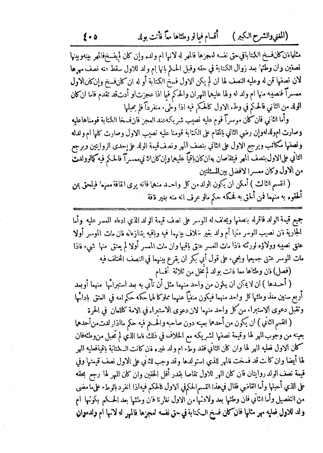 جميع قيمة الولد فأقر له بنصفها ويحلف له الموسر على نصف قيمة الولد الذي ادعاه المعسر عليه وأما الجارية فإن نصيب الموسر منها أم ولد بغير خلاف بينهما فيه وباقيه يتنازعانه فإن مات الموسر أولاً عتق نصيبه وولاؤه لورثته فإذا مات المعسر عتق باقيها وإن مات المعسر أولاً لم يعتق منها شئ فإذا مات الموسر عتق جميعها ويجئ على قول أبي بكر أن يقرع بينهما في النصف المختلف فيه (فصل) فإن وطئاها معاً فأتت بولد لم تخل من ثلاثة أقسام (أحدها) أن لا يمكن أن يكون من واحد منهما مثل أن تأتي به بعد استبرائها منهما أو بعد أربع سنين منذ وطئها كل واحد منهما فيكون منفياً عنهما مملوكاً لهما حكمه حكم أمه في العتق بأدائها وتقبل دعوى الاستبراء من كل واحد منهما لأن دعوى الاستبراء في الأمة كاللعان في الحرة (القسم الثاني) أن يكون من أحدهما بعينه دون صاحبه والحكم فيه حكم ما إذا ولدت من أحدهما بعينه من وجوب المهر لها وقيمة نصفها لشريكه مع الخلاف في ذلك فأما الذي لم تحبل من وطئه فإن كان الأول فعليه المهر لها وإن كان الثاني فقد وطئ أم ولد غيره فإن كانت الكتابة باقية فعليه المهر لها أيضاً وإن كانت قد فسخت فالمهر للذي استولدها وقد وجب للثاني على الأول نصف قيمتها وفي