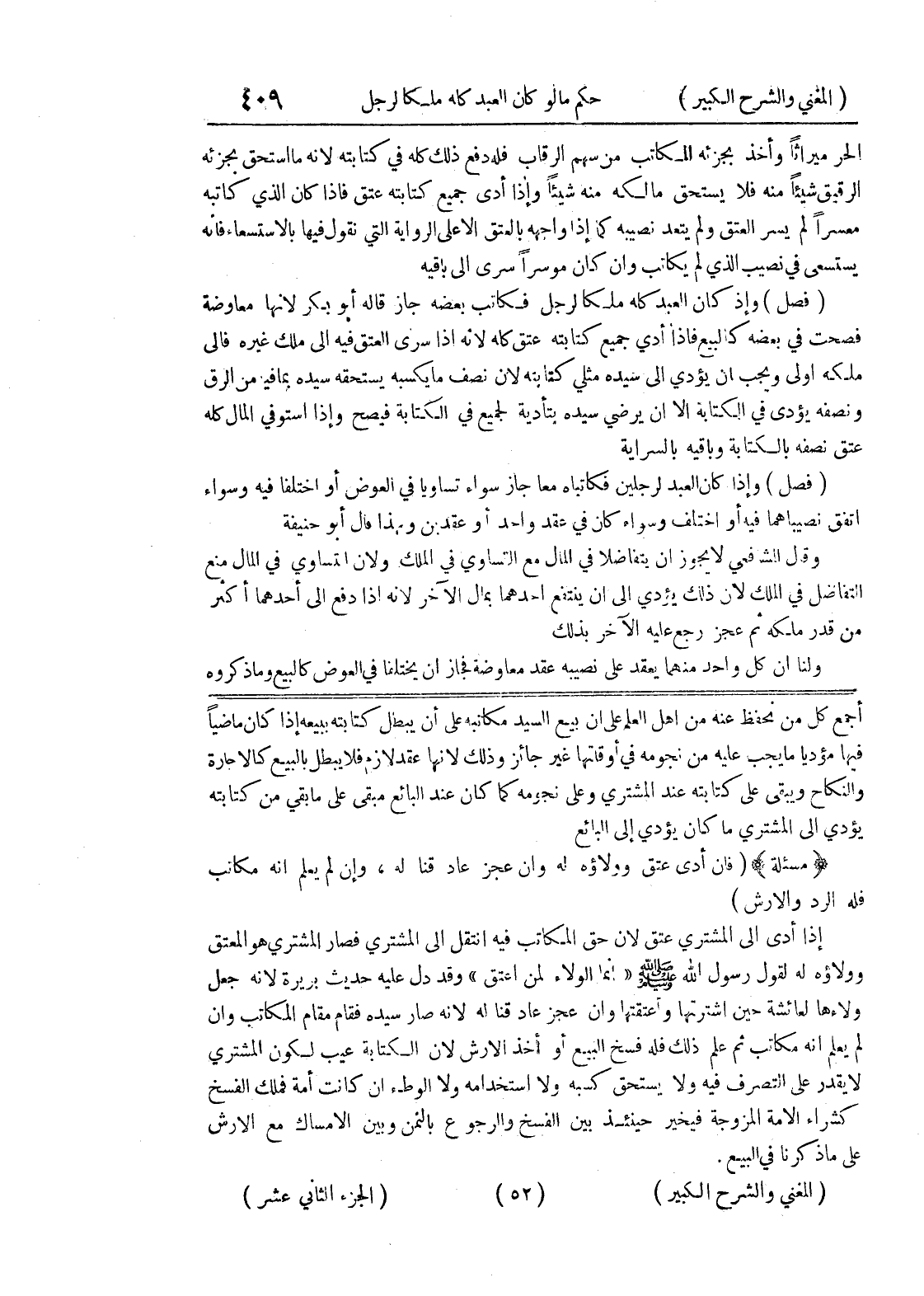 أجمع كل من نحفظ عنه من أهل العلم على أن بيع السيد مكاتبه على أن يبطل كتابته ببيعه إذا كان ماضياً فيها مؤدياً ما يجب عليه من نجومه في أوقاتها غير جائز وذلك لأنها عقد لازم فلا يبطل بالبيع كالإجارة والنكاح ويبقى على كتابته عند المشتري وعلى نجومه كما كان عند البائع مبقى على ما بقي من كتابته يؤدي إلى المشتري ما كان يؤدي إلى البائع (مسألة) (فإن أدى عتق وولاؤه له وإن عجز عاد قناً له، وإن لم يعلم أنه مكاتب فله الرد والأرش) إذا أدى إلى المشتري عتق لأن حق المكاتب فيه انتقل إلى المشتري فصار المشتري هو المعتق وولاؤه له لقول رسول الله صلى الله عليه وسلم (إنما الولاء لمن أعتق) وقد دل عليه حديث بريرة لانه جعل ولاءها لعائشة حين اشترتها وأعتقتها وإن عجز عاد قناً له لأنه صار سيده فقام مقام المكاتب وإن لم يعلم أنه مكاتب ثم علم ذلك فله فسخ البيع أو أخذ الأرش لأن الكتابة عيب لكون المشتري لا يقدر على التصرف فيه ولا يستحق كسبه ولا استخدامه ولا الوطئ إن كانت أمة فملك الفسخ كشراء الأمة المزوجة فيخير حينئذ بين الفسخ والرجوع بالثمن وبين الإمساك مع الأرش على ما ذكرنا في البيع